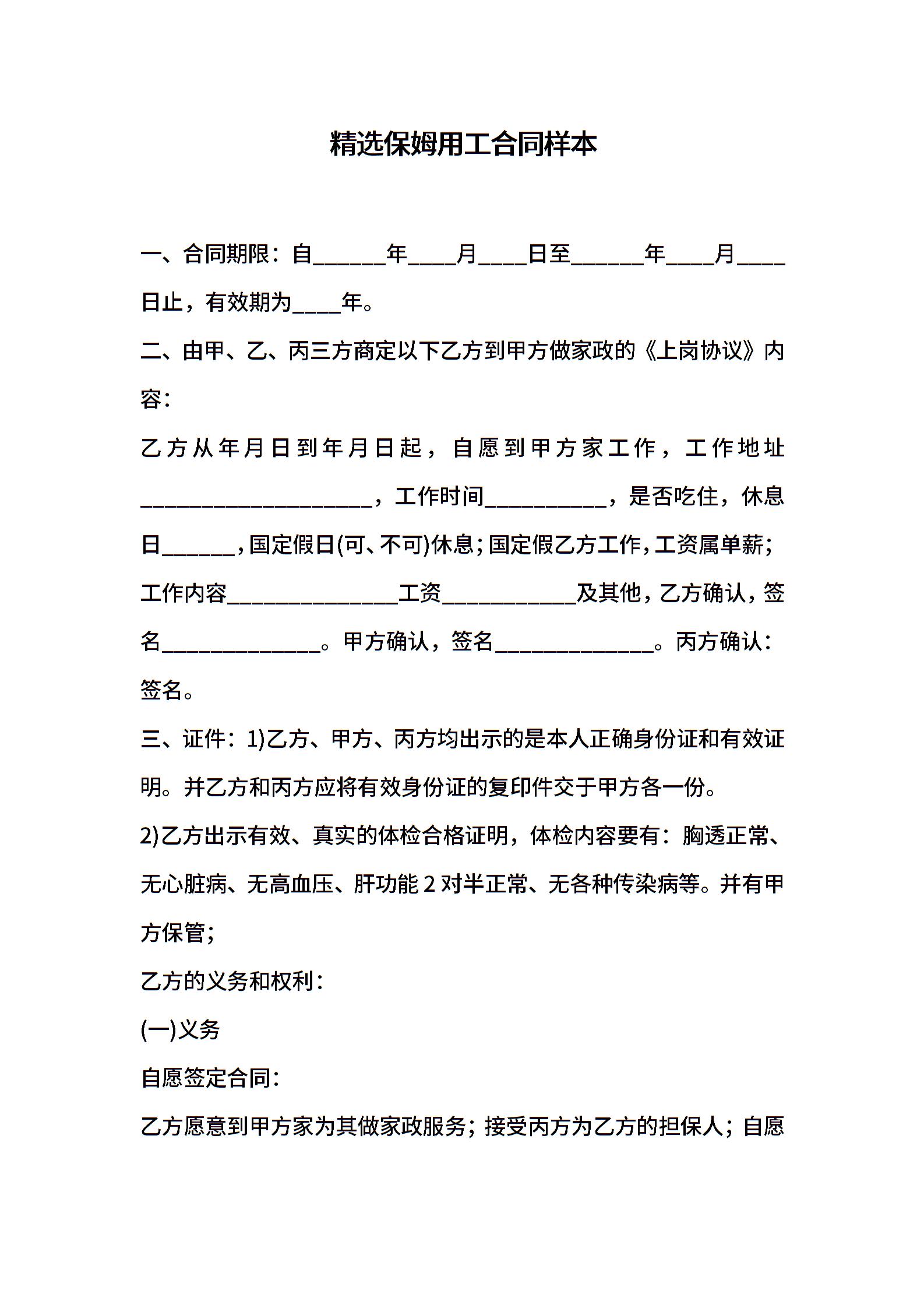 精选保姆用工合同样本
