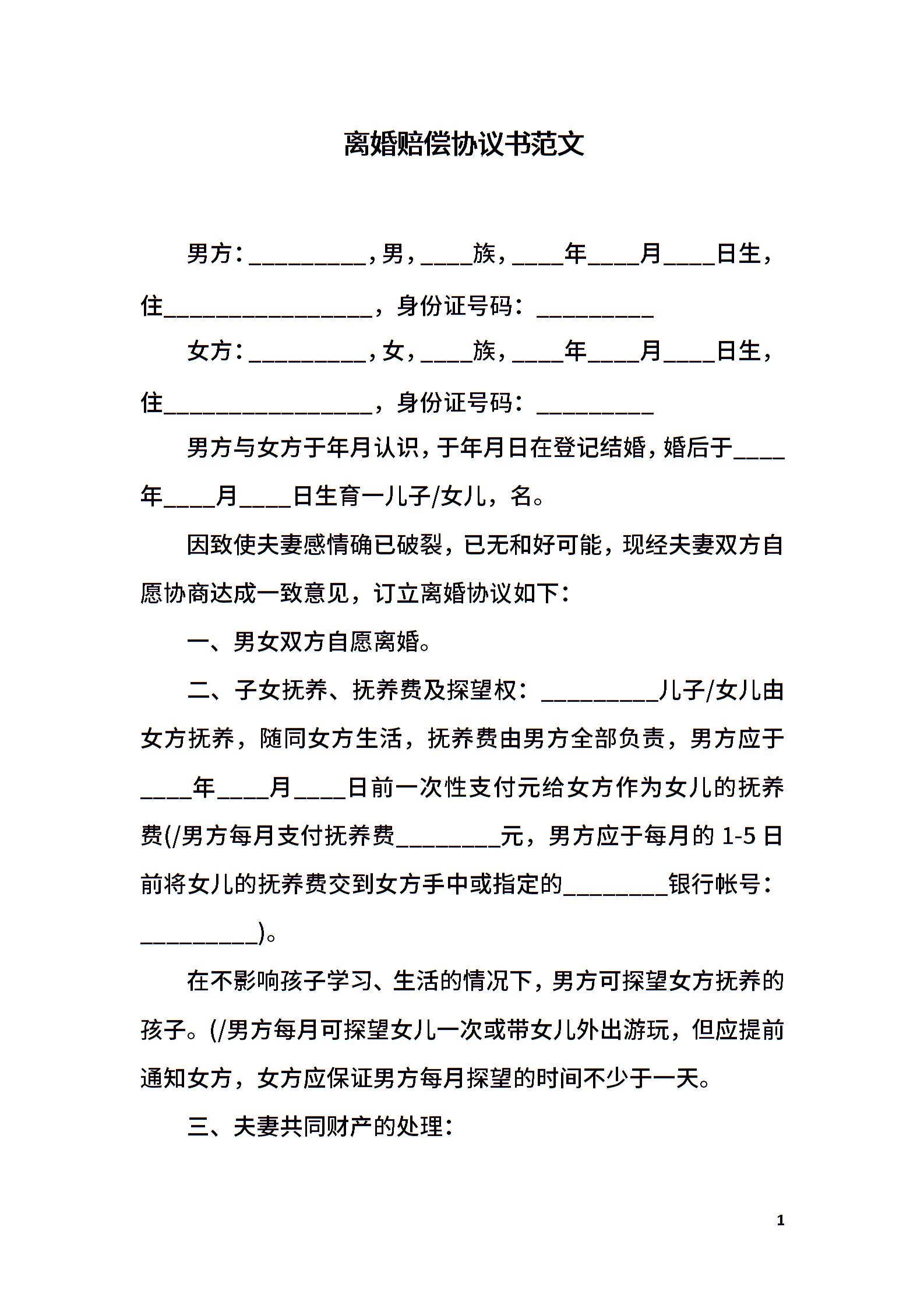 离婚赔偿协议书范文