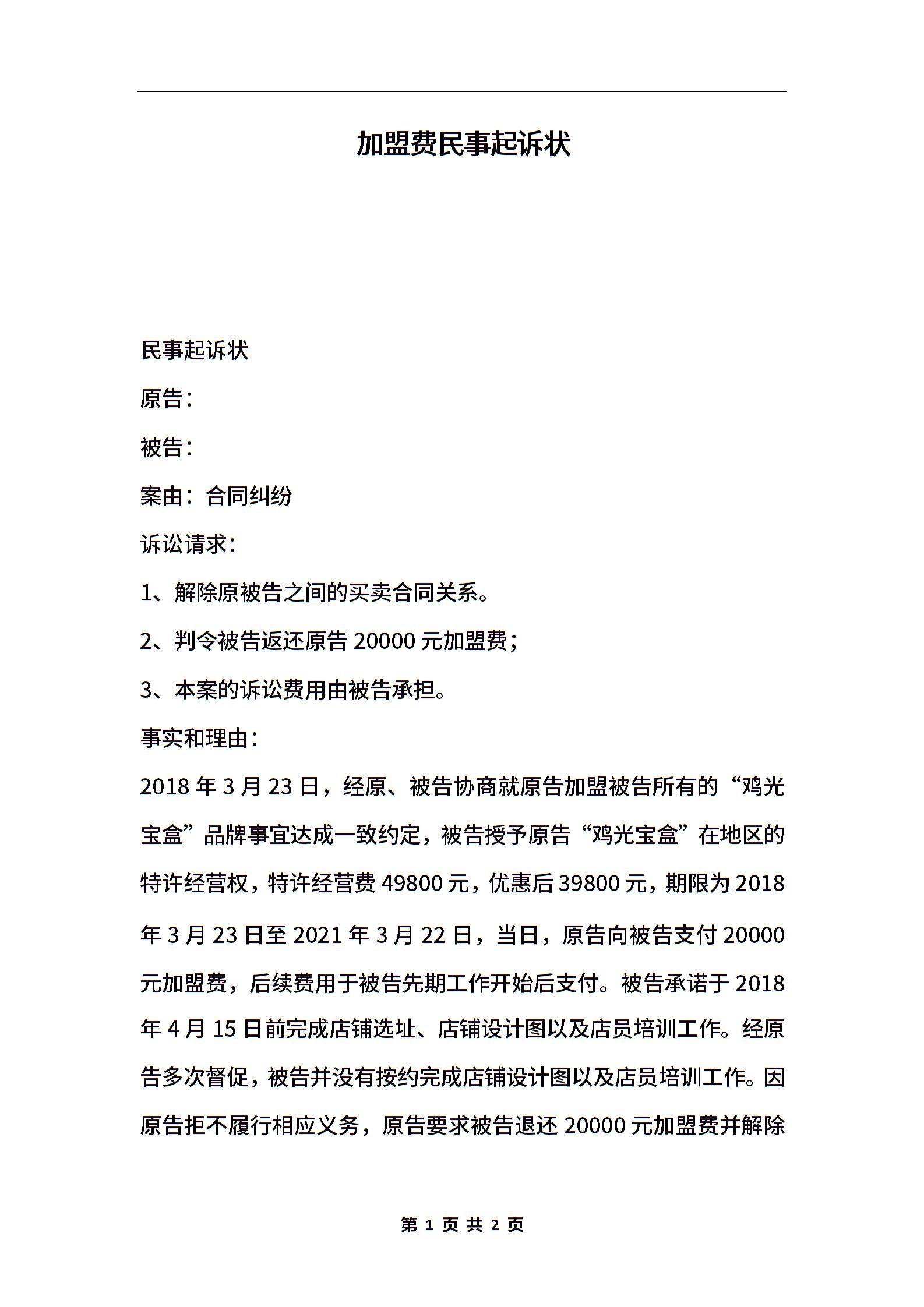 加盟费民事起诉状