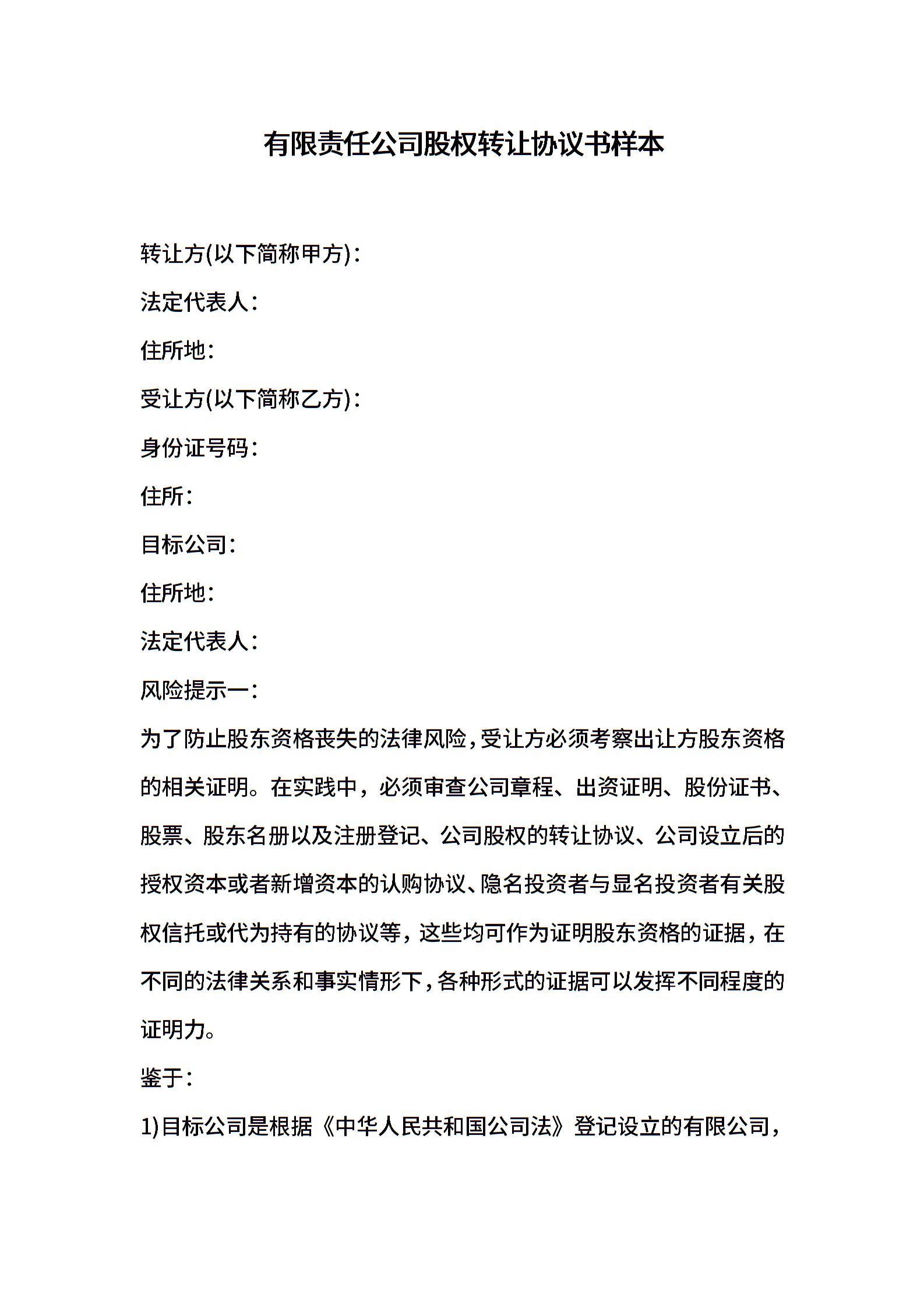 有限责任公司股权转让协议书样本