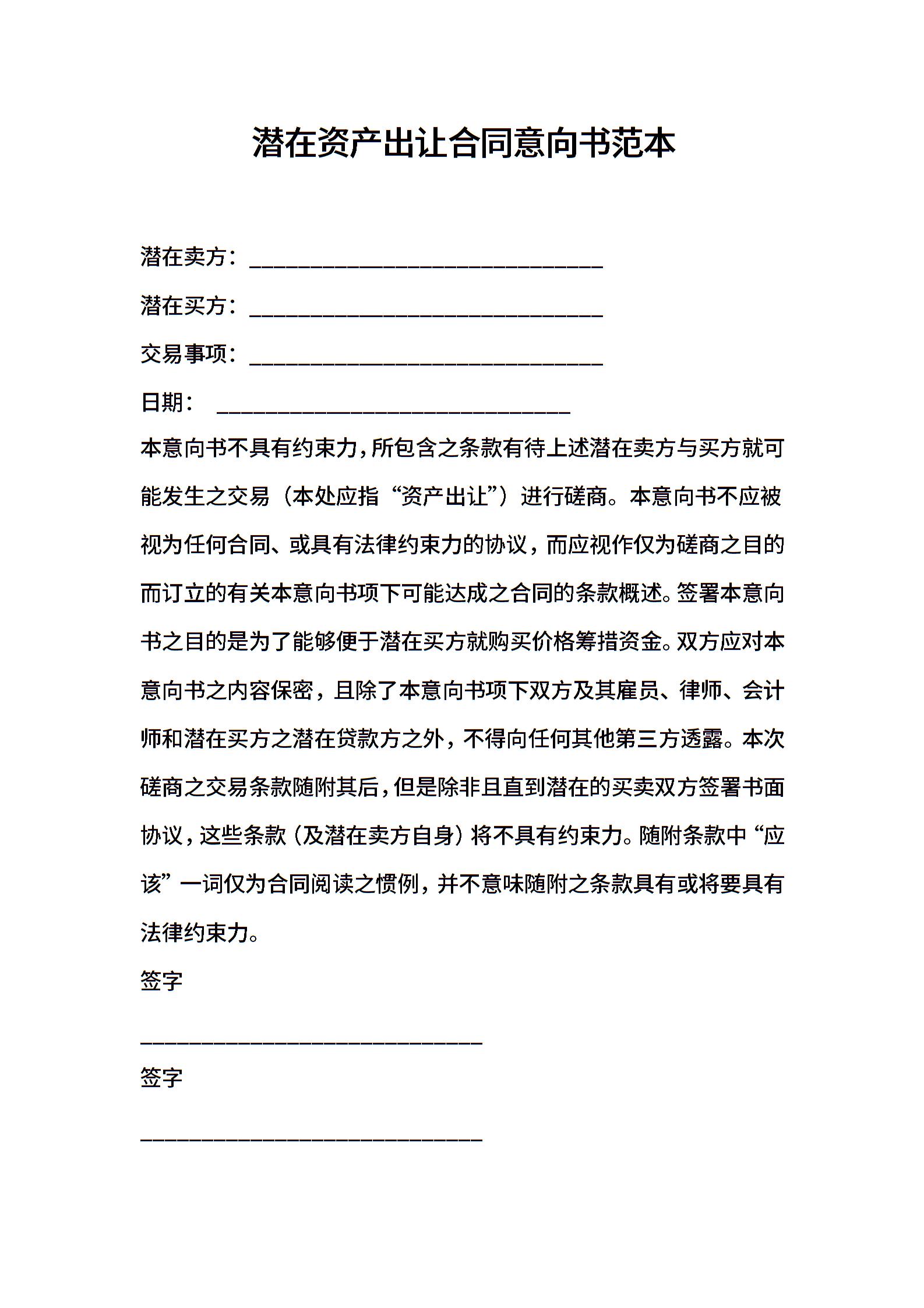 潜在资产出让合同意向书范本