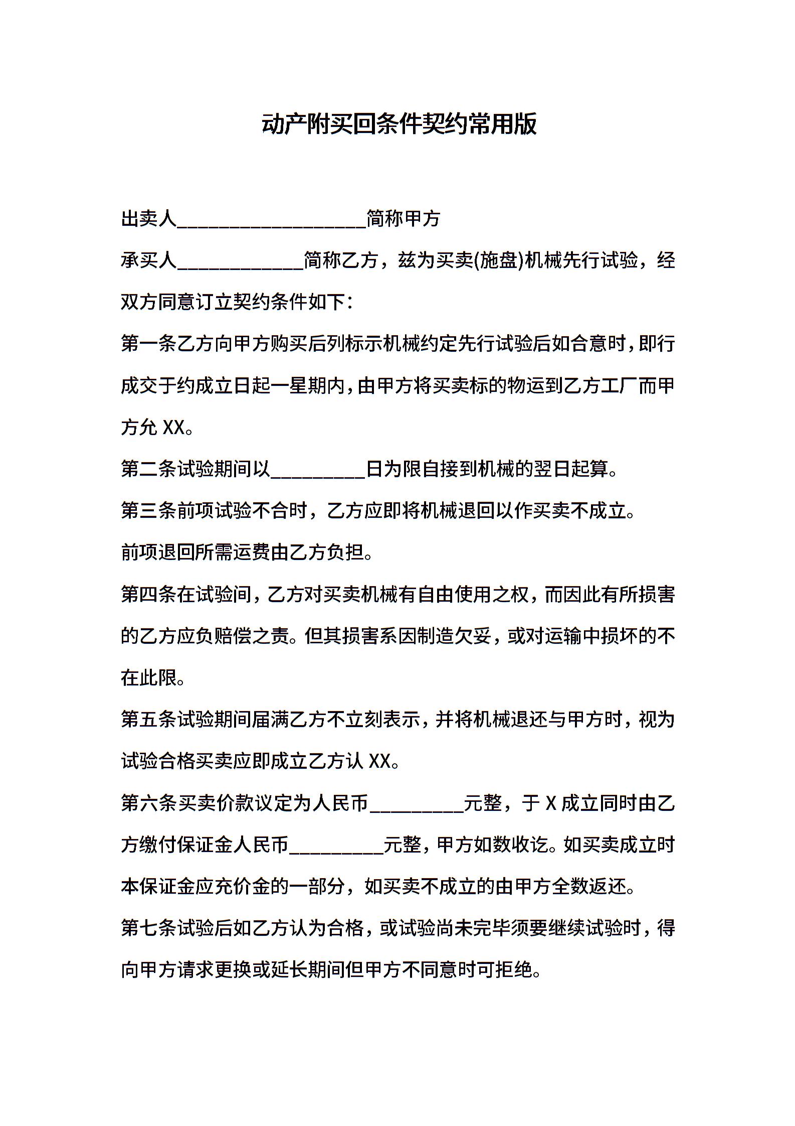 动产附买回条件契约常用版