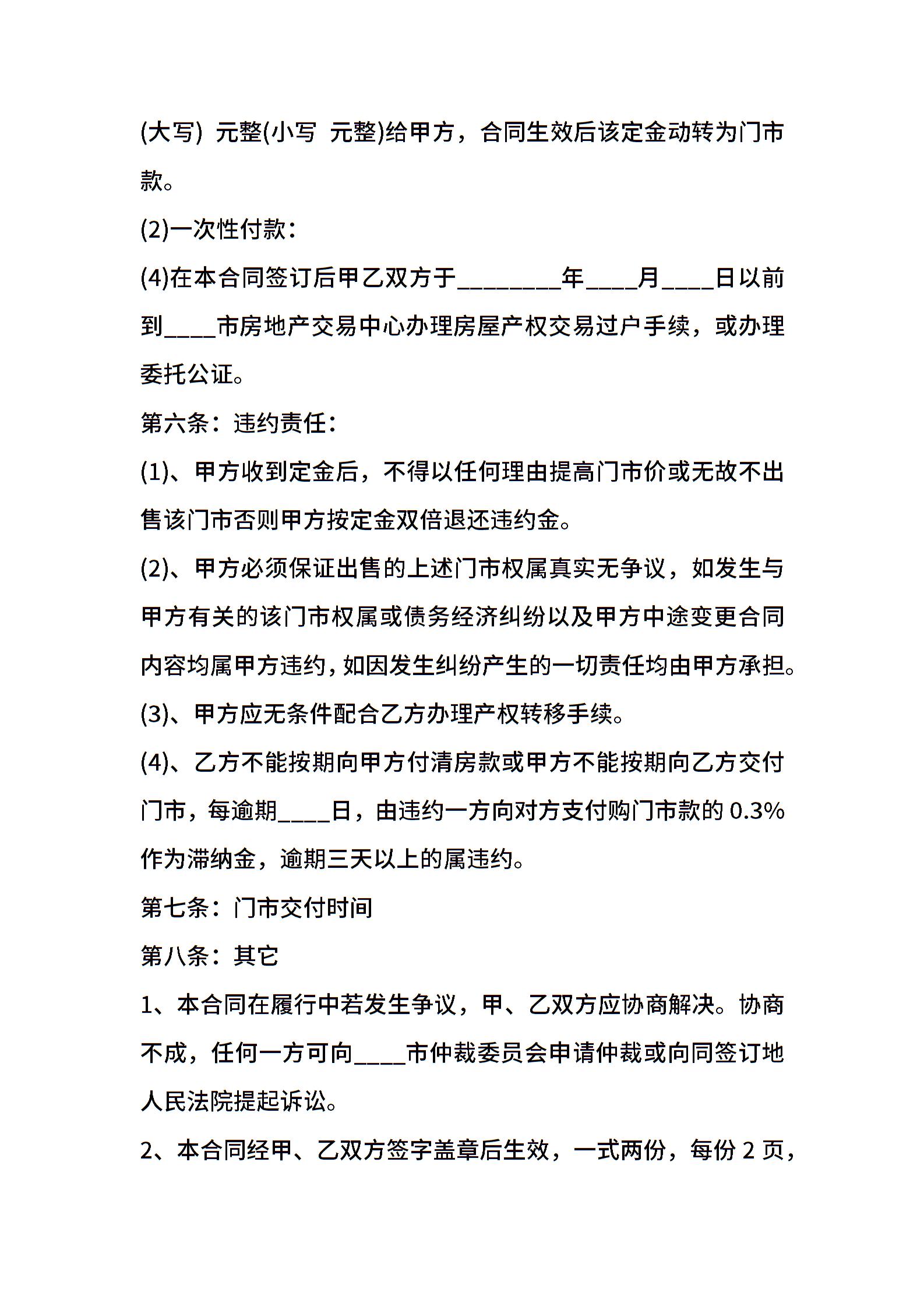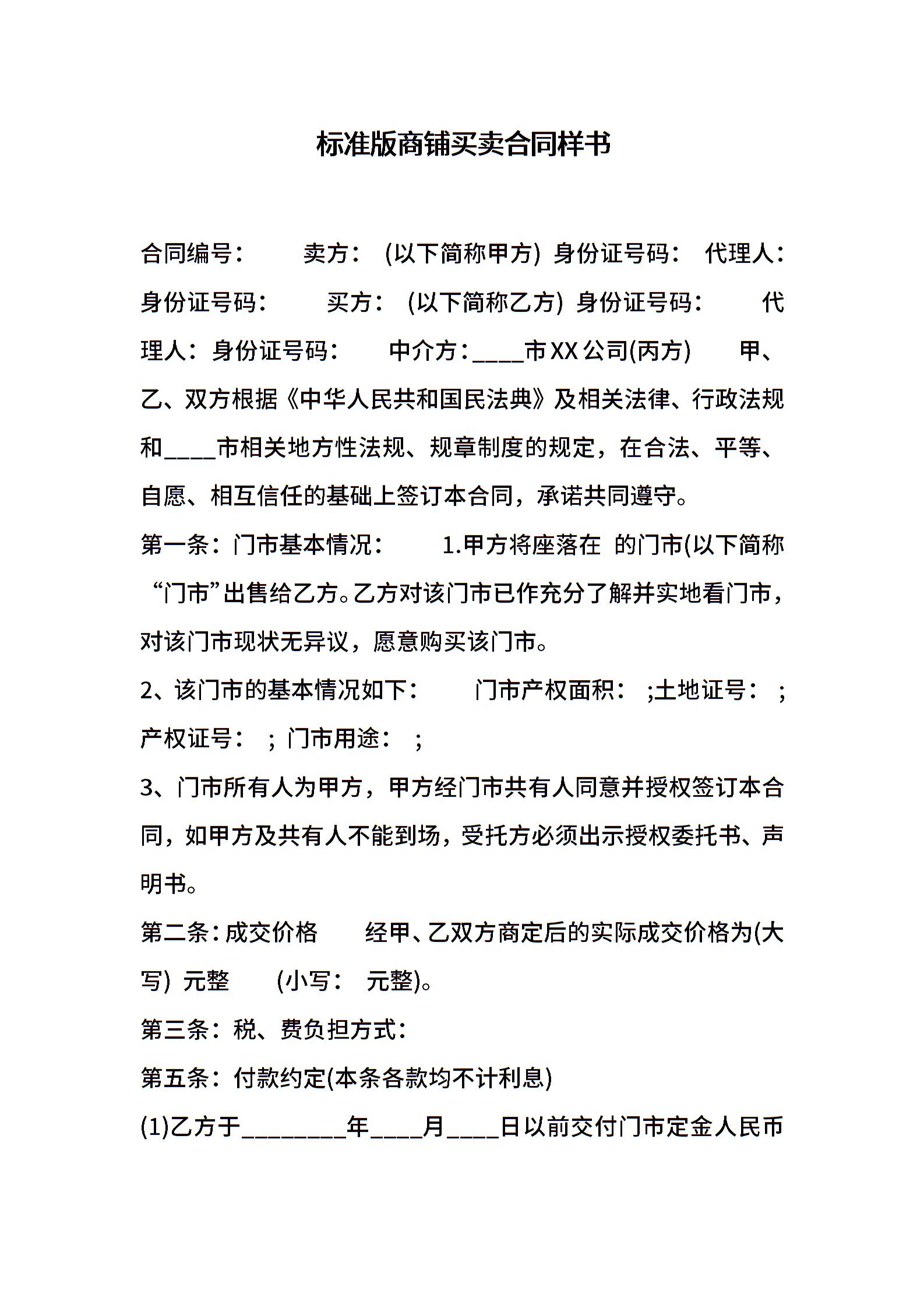 标准版商铺买卖合同样书