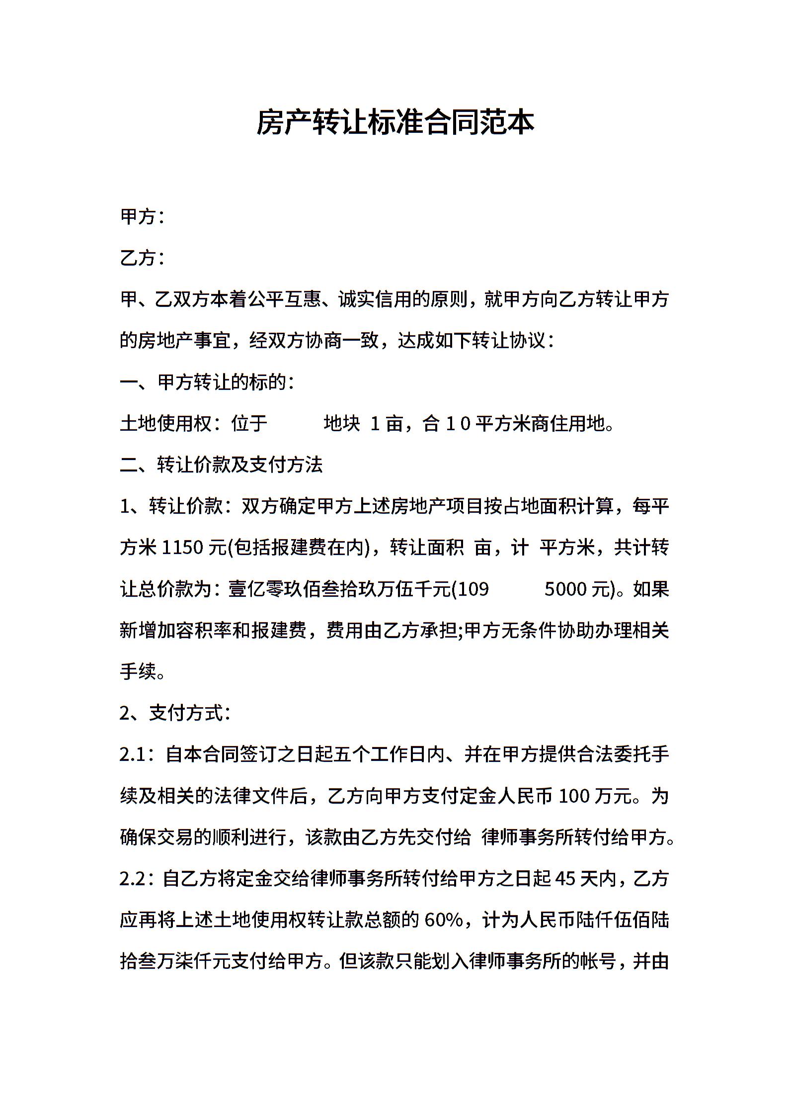 房产转让标准合同范本