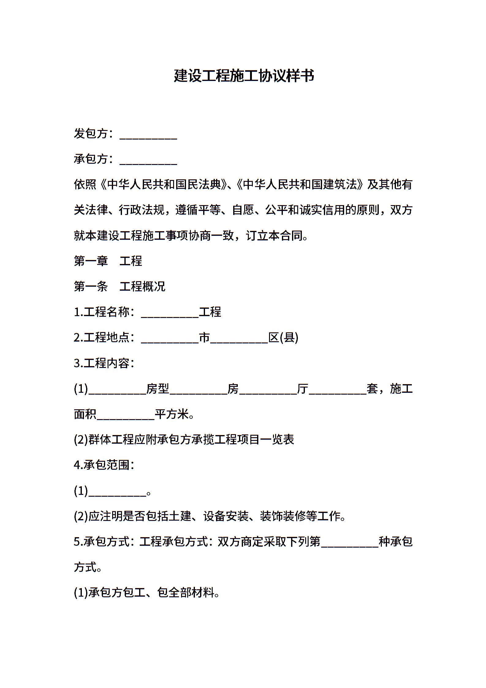 建设工程施工协议样书