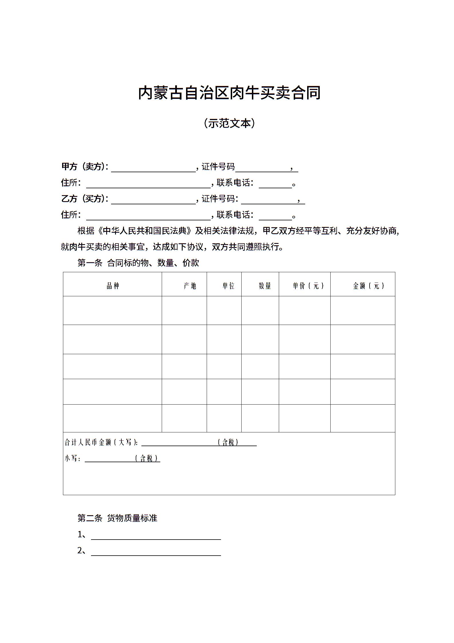 内蒙古自治区肉牛买卖合同(示范文本)