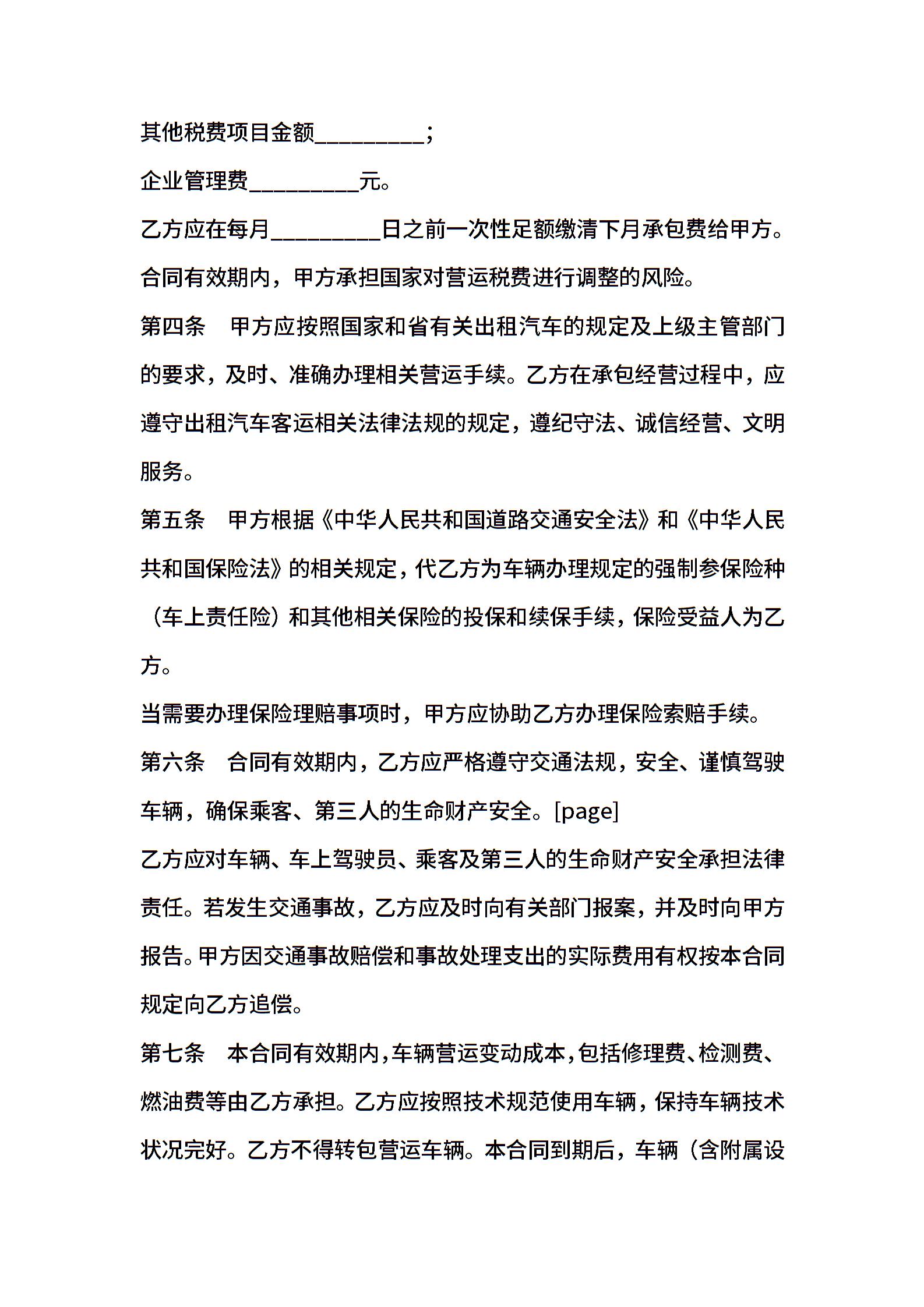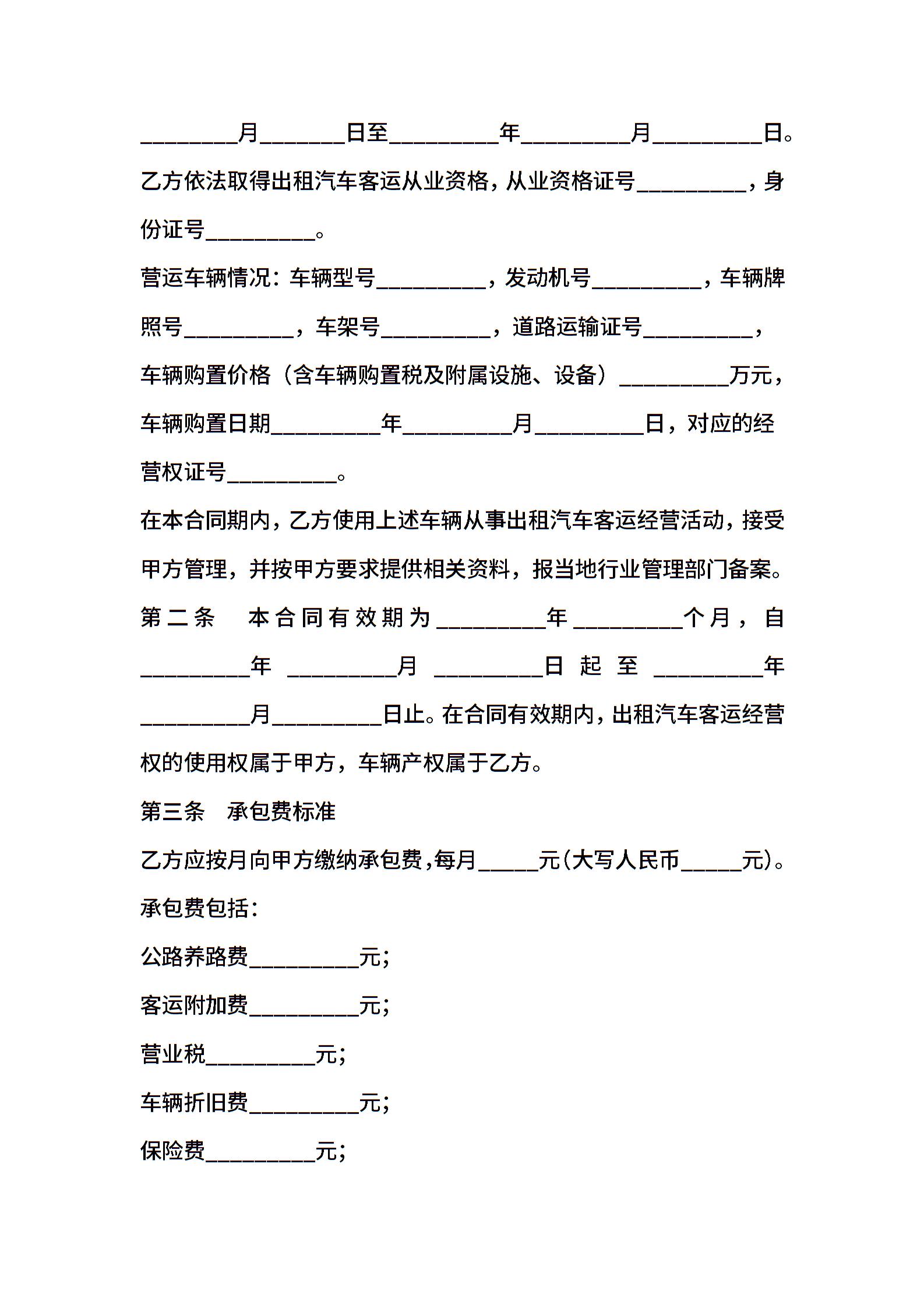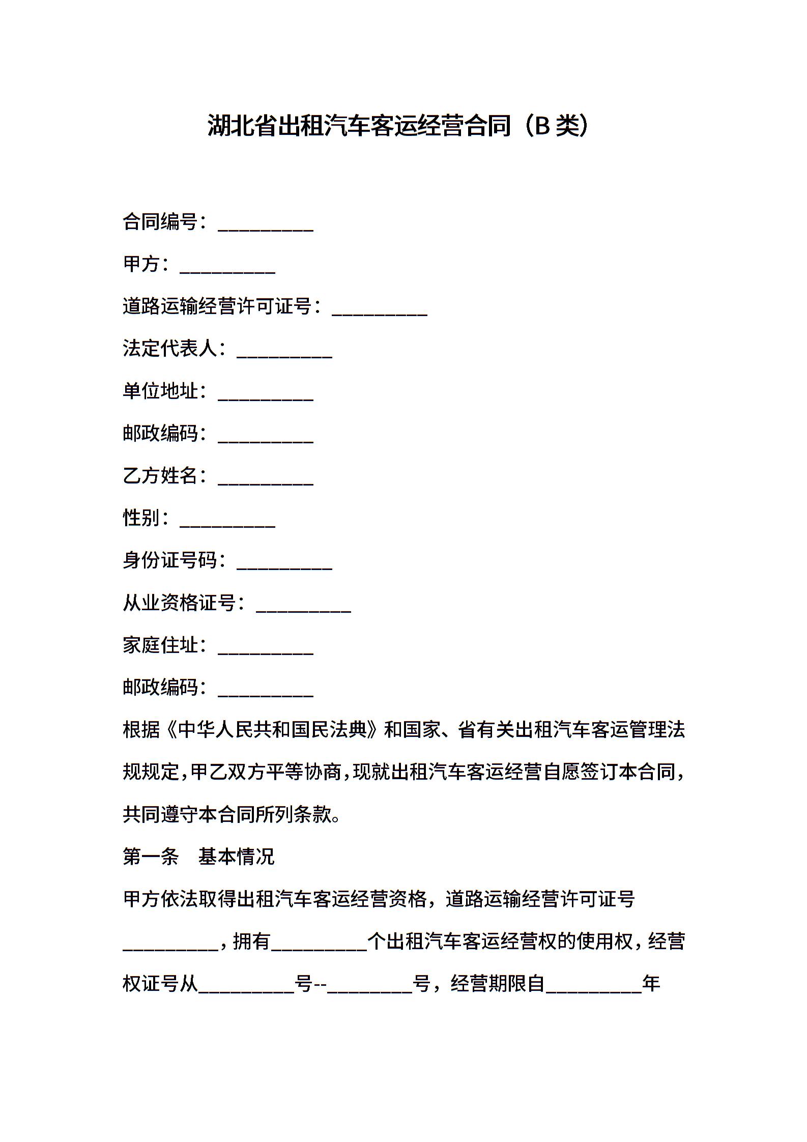 湖北省出租汽车客运经营合同(B类)