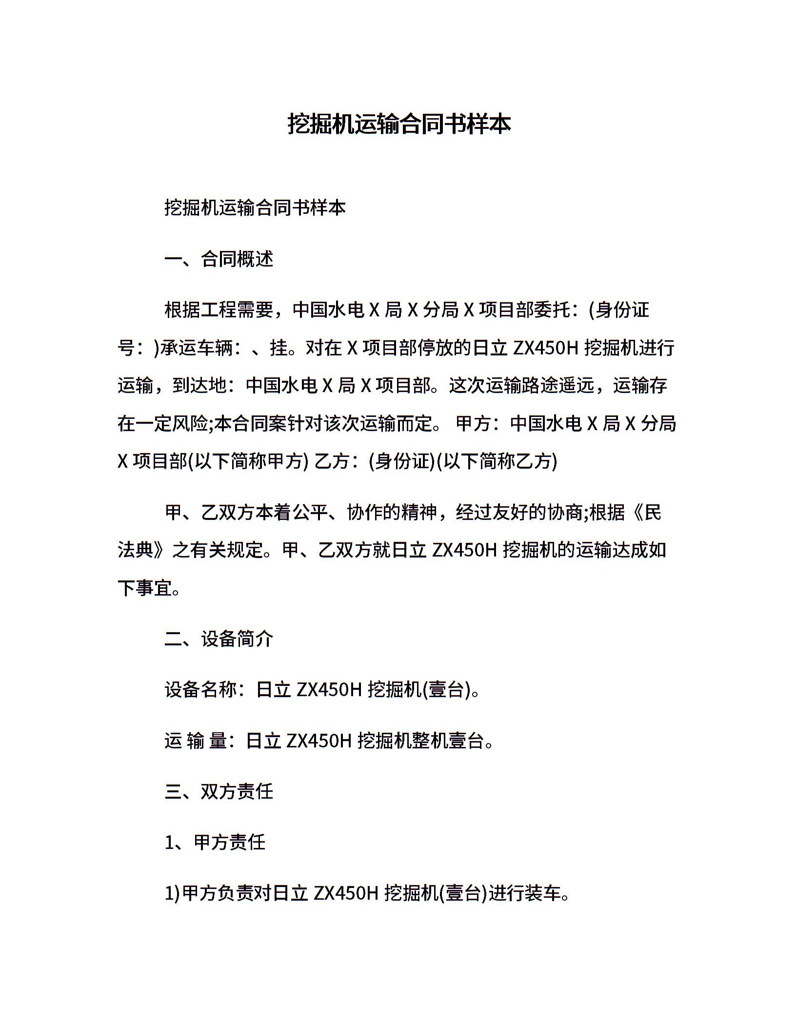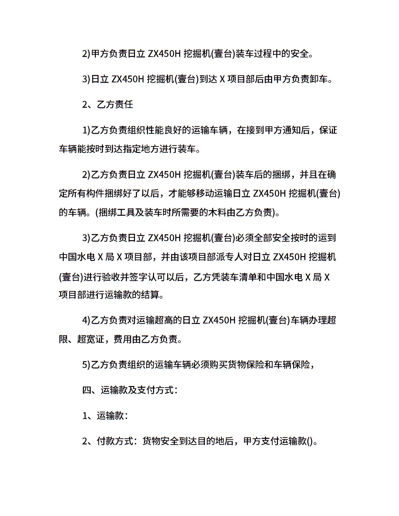 挖掘机运输合同书样本