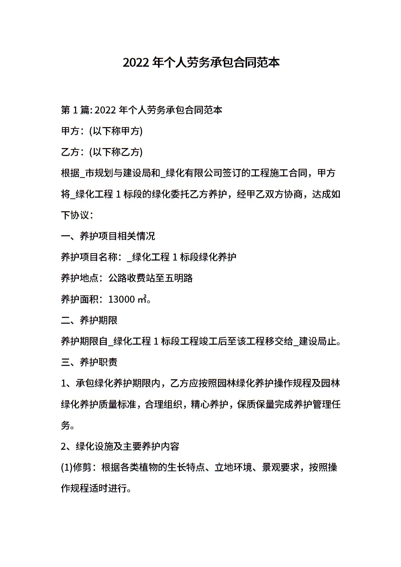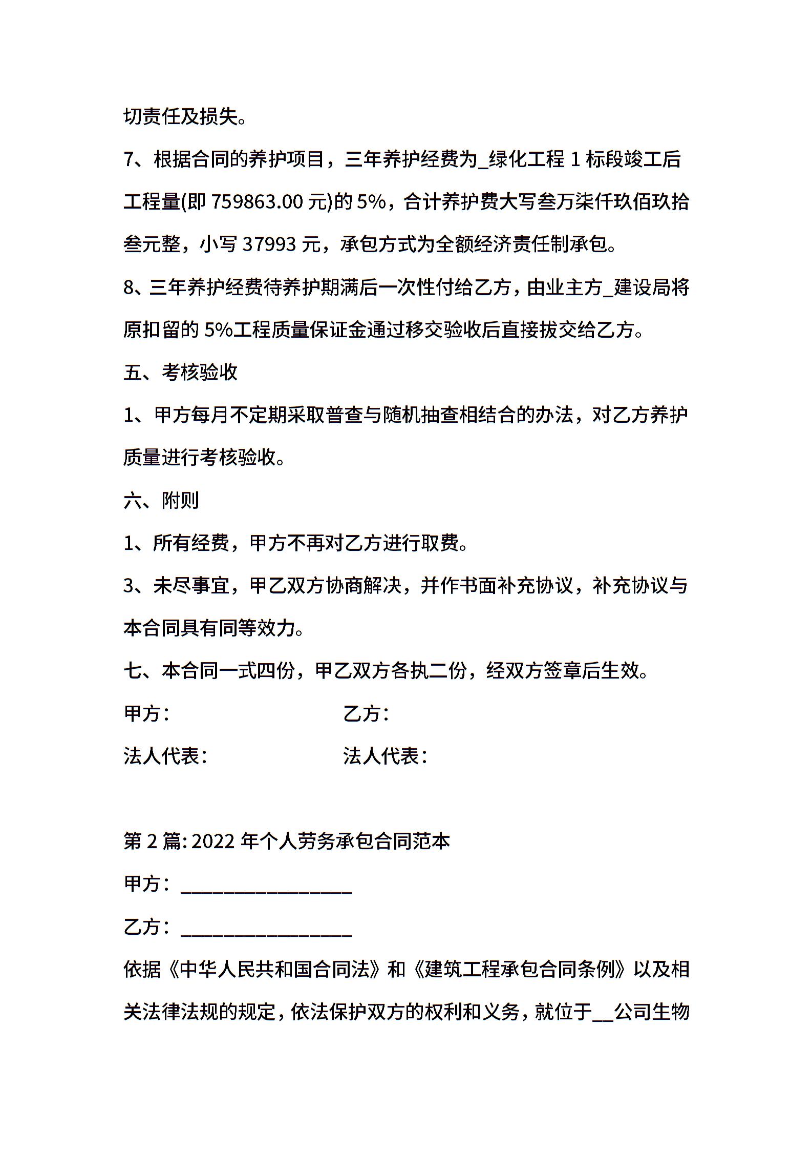 2022年个人劳务承包合同范本