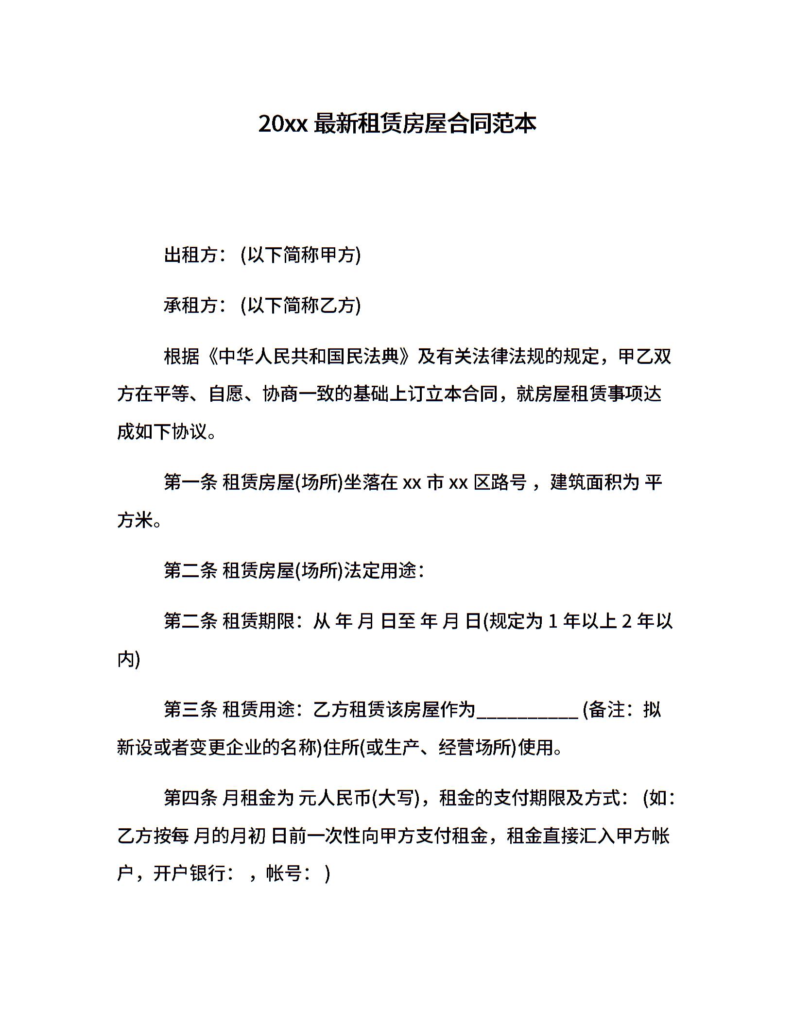 20xx最新租赁房屋合同范本