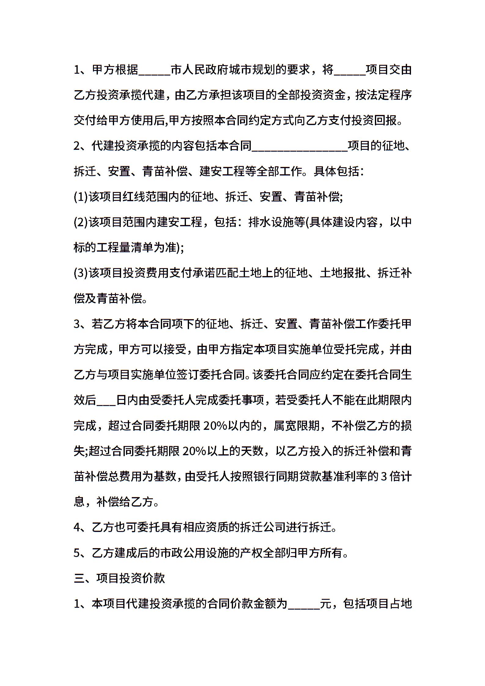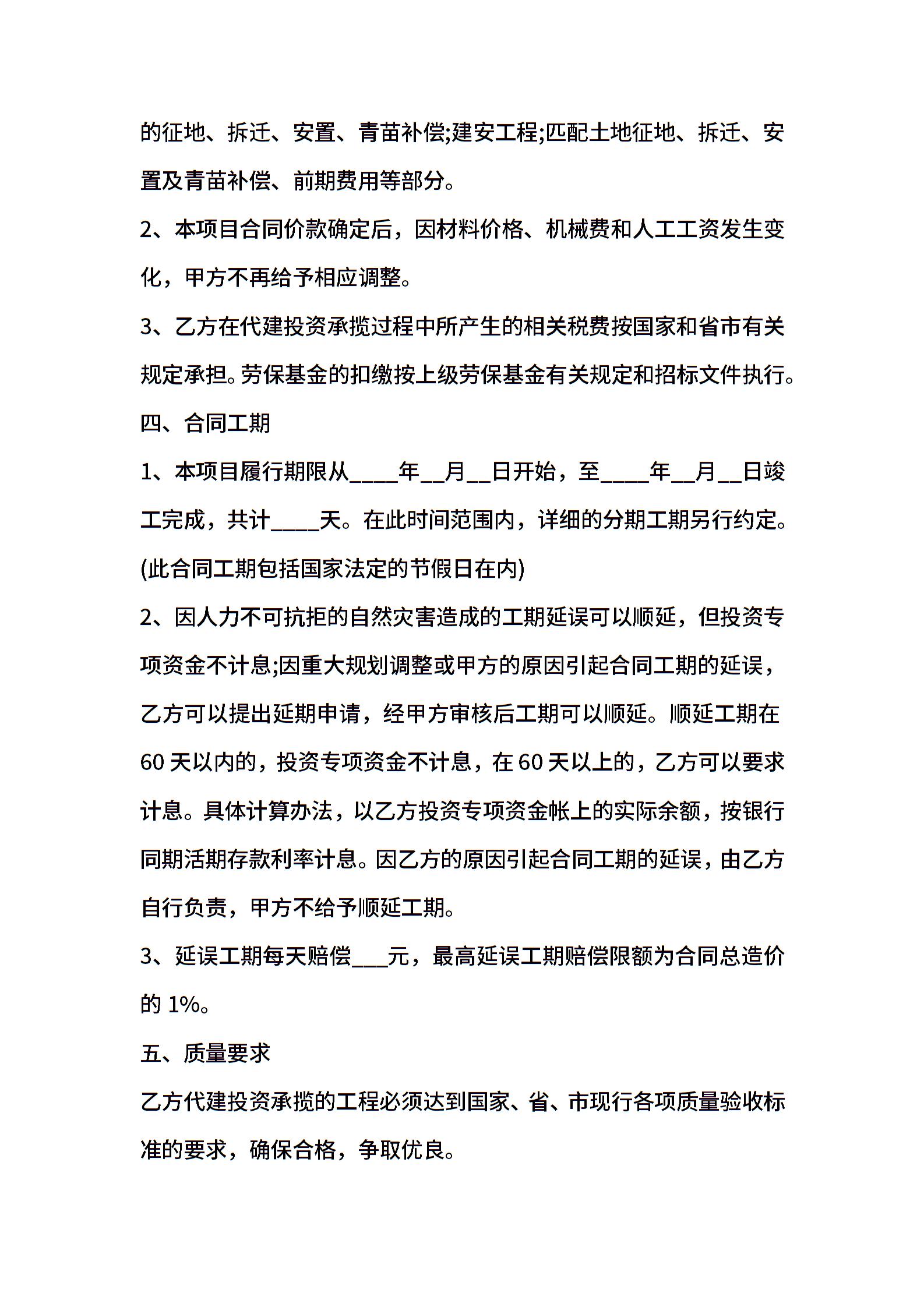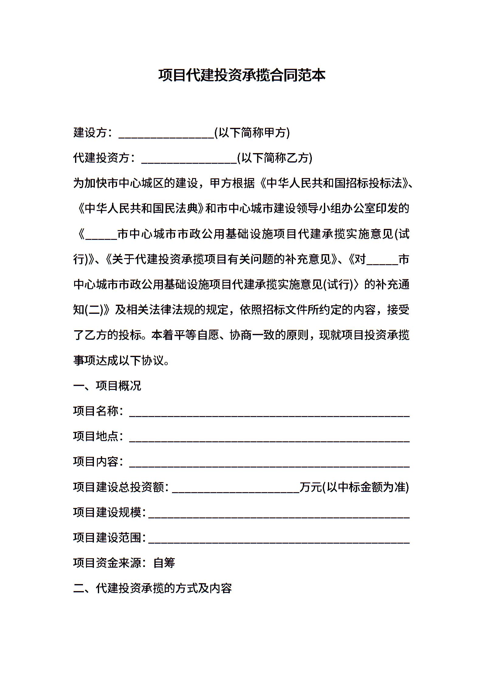 项目代建投资承揽合同范本