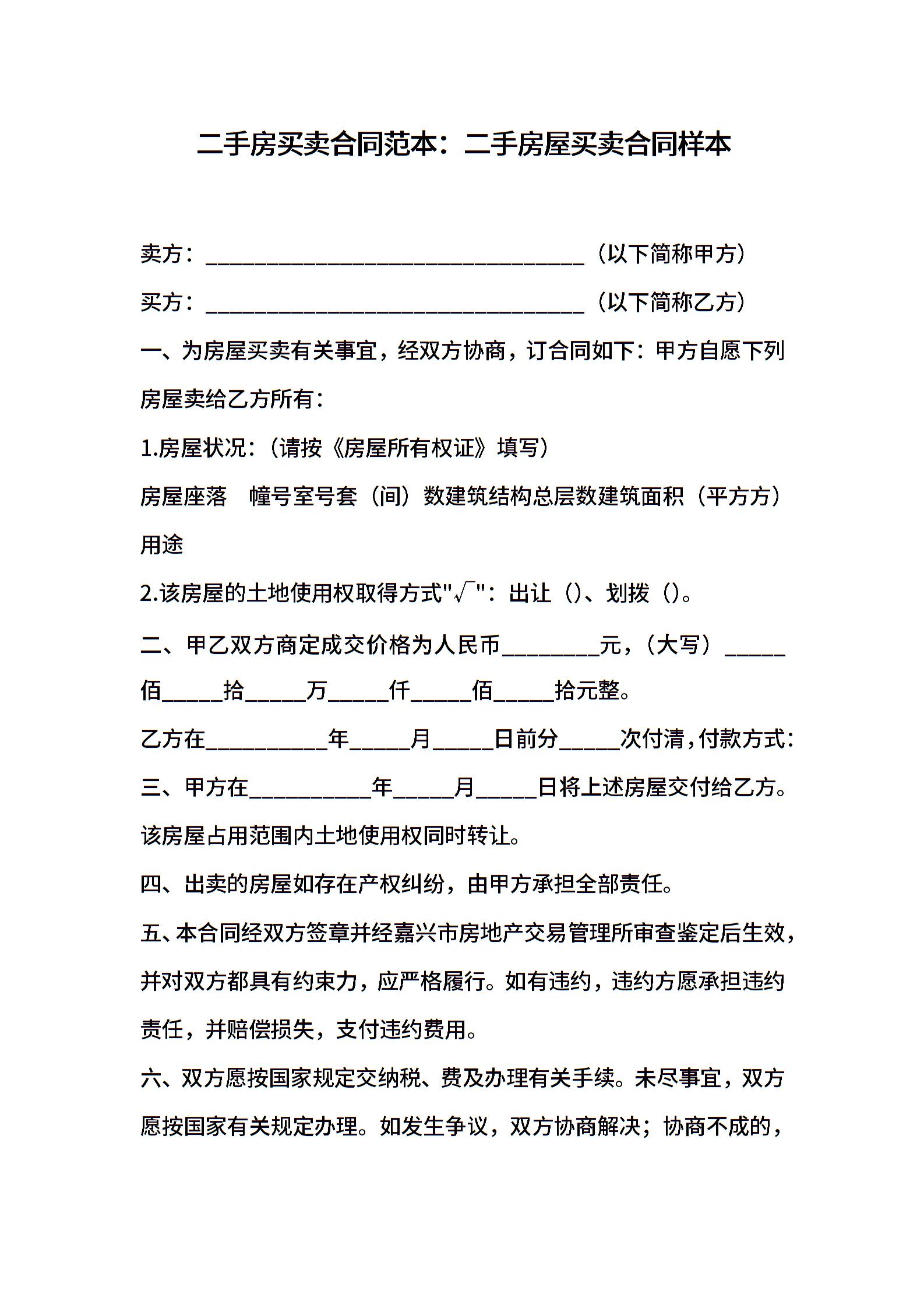 二手房屋买卖合同样本 (2)