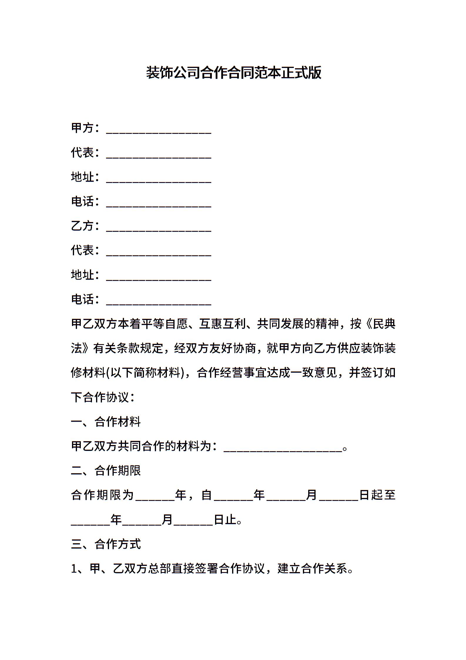 装饰公司合作合同范本正式版