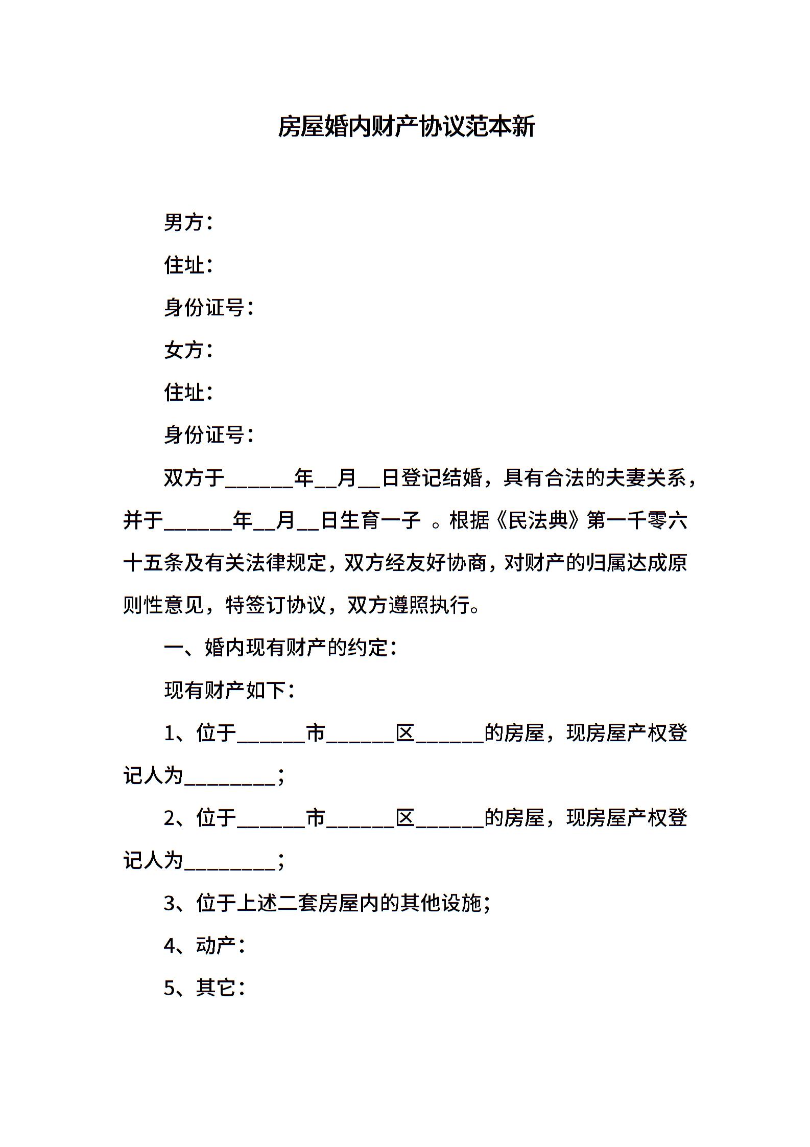 房屋婚内财产协议范本新