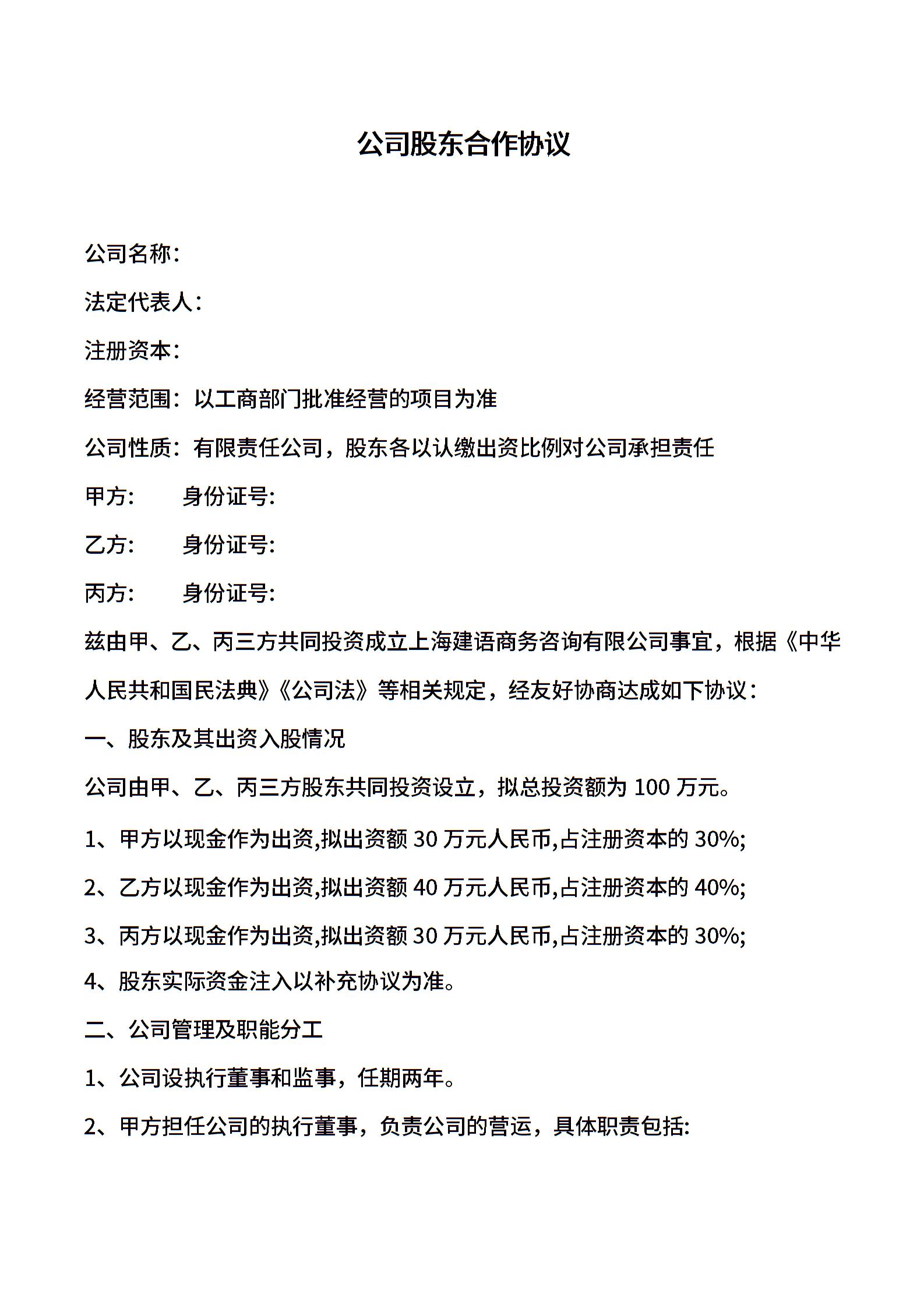 公司股东合作协议书模板