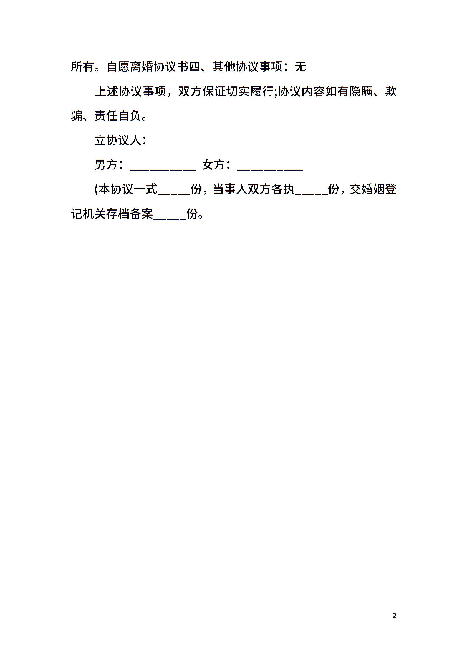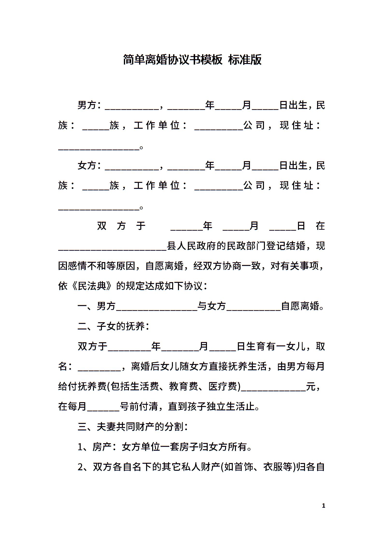 简单离婚协议书模板 标准版