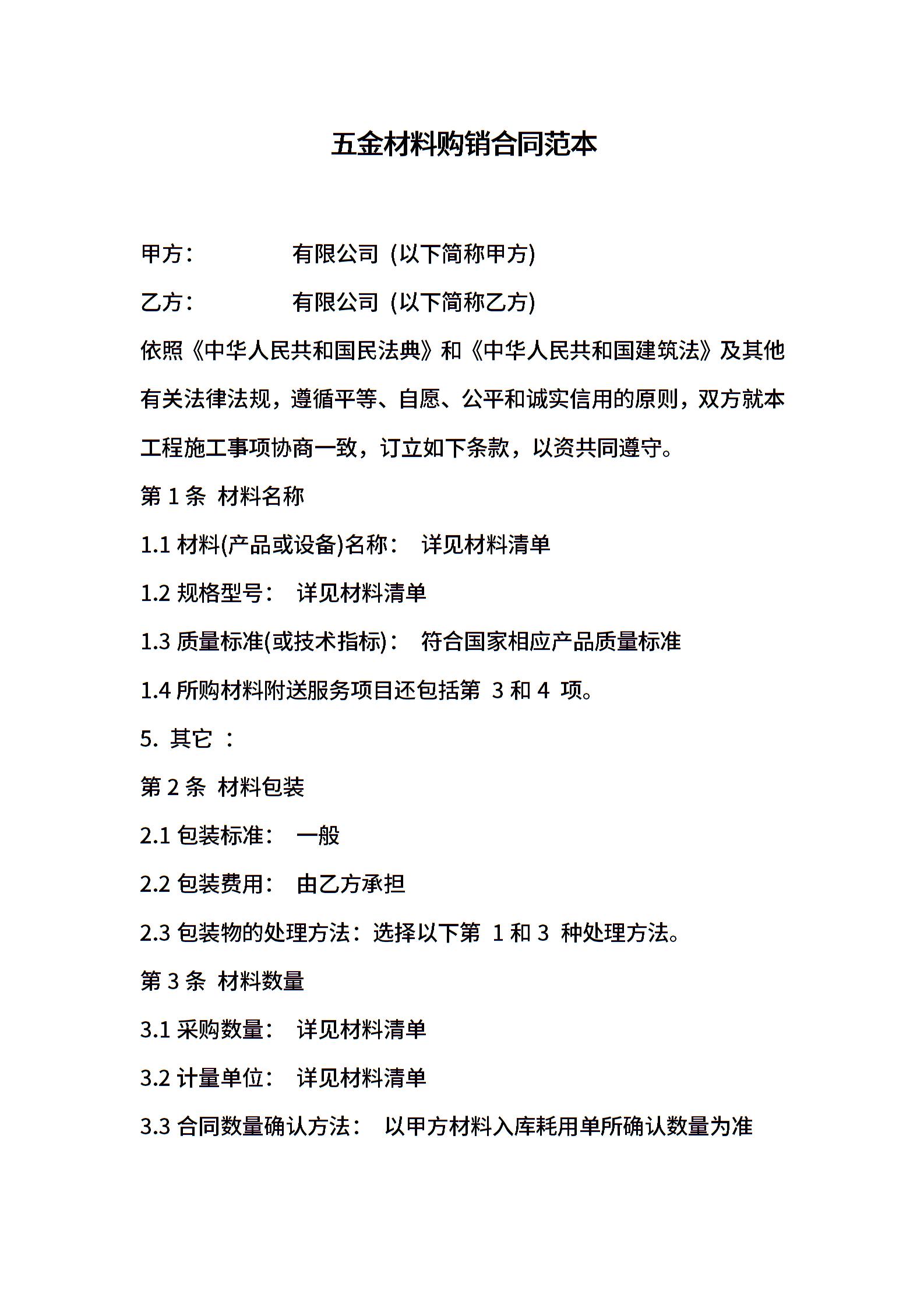 五金材料购销合同范本