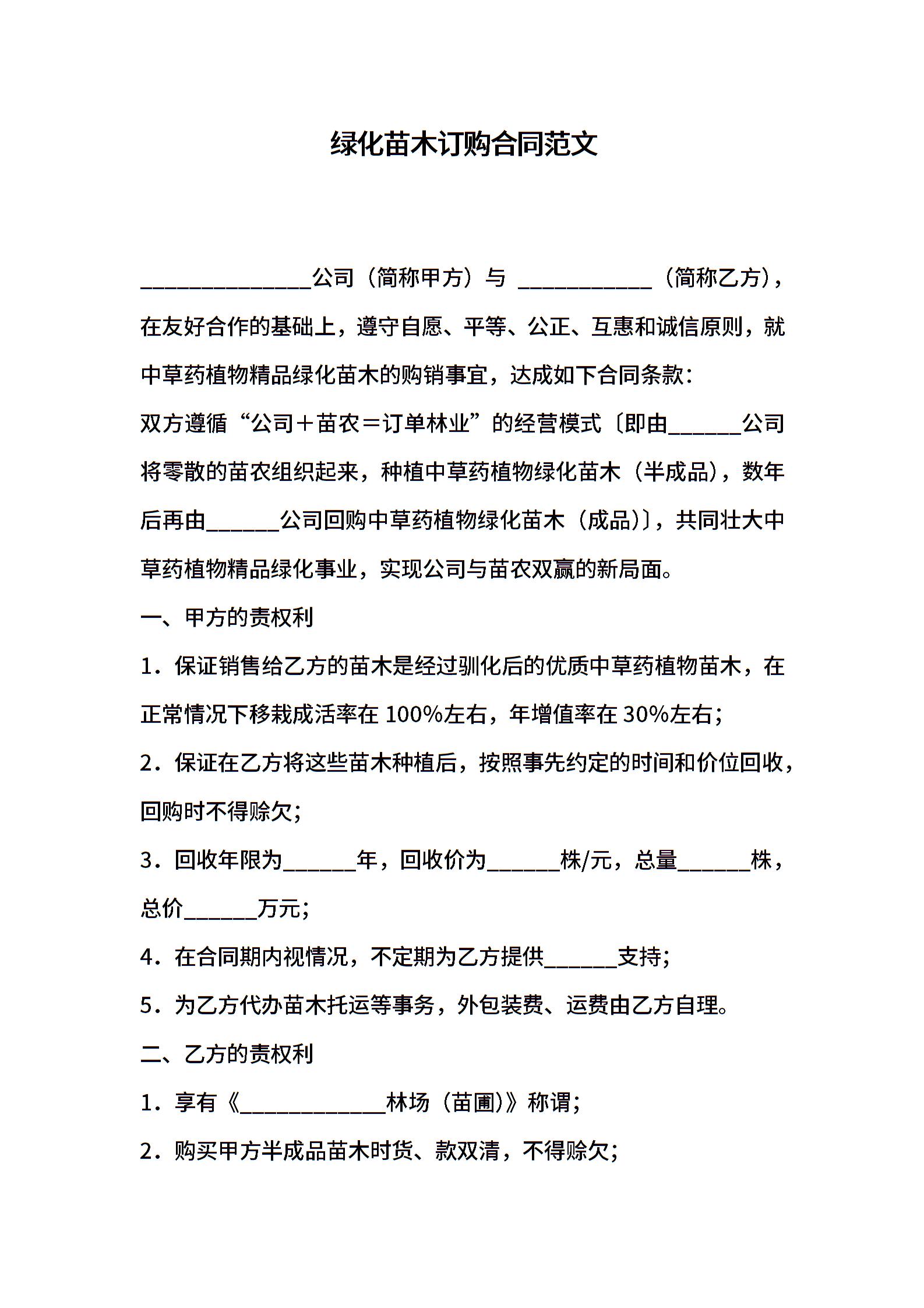 绿化苗木订购合同范文
