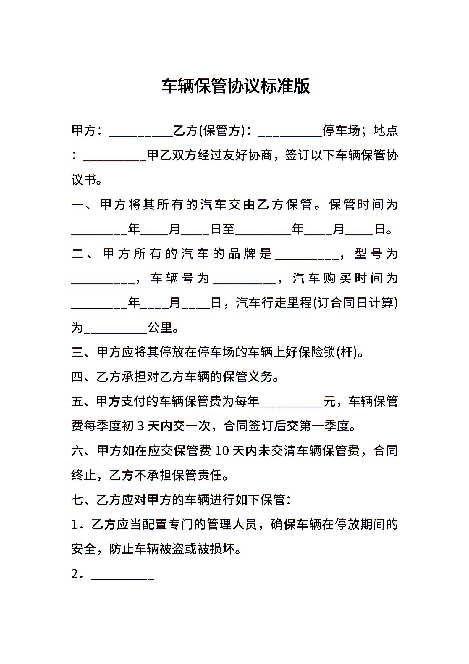 车辆保管协议标准版