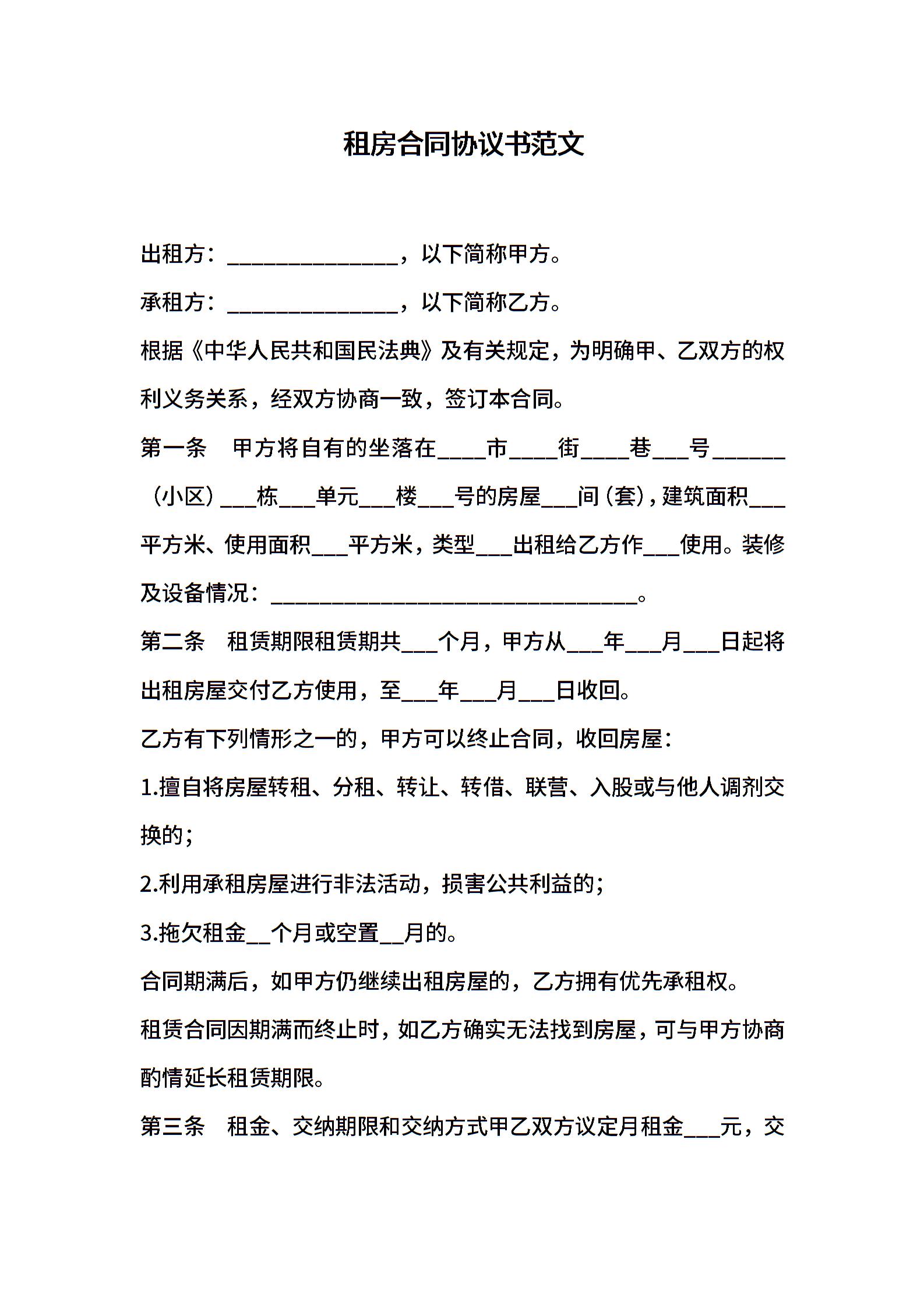 租房合同协议书范文