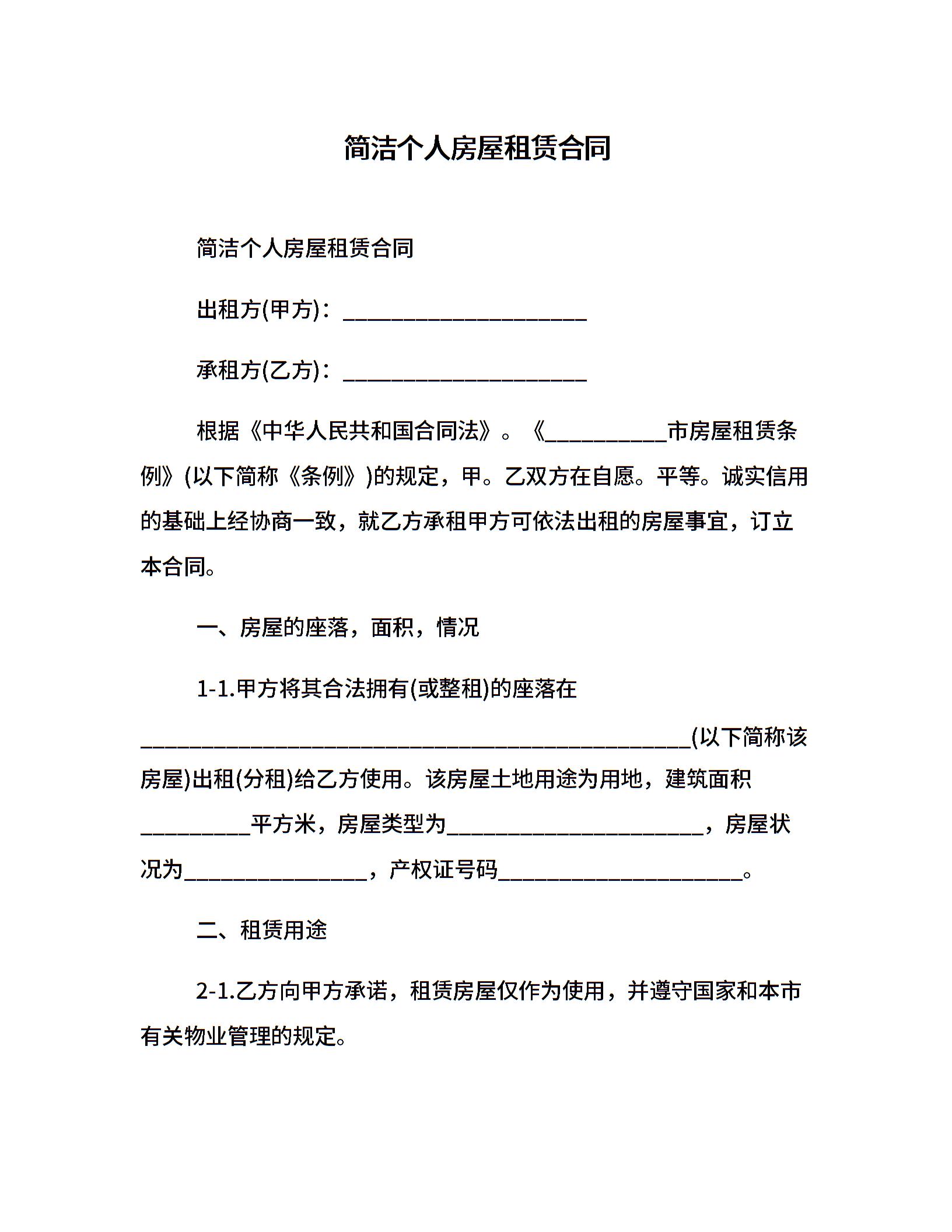 简洁个人房屋租赁合同