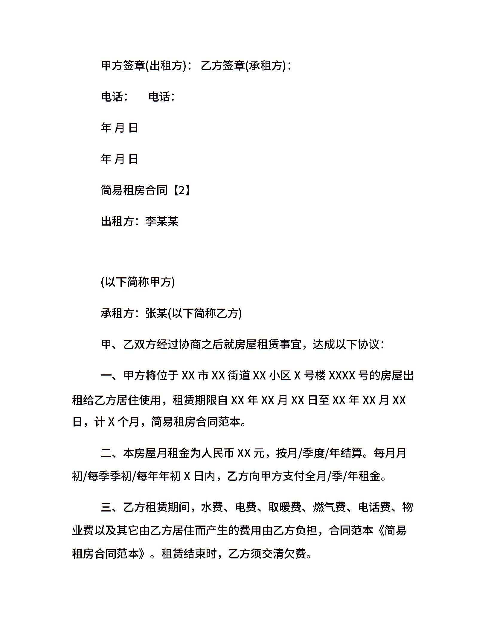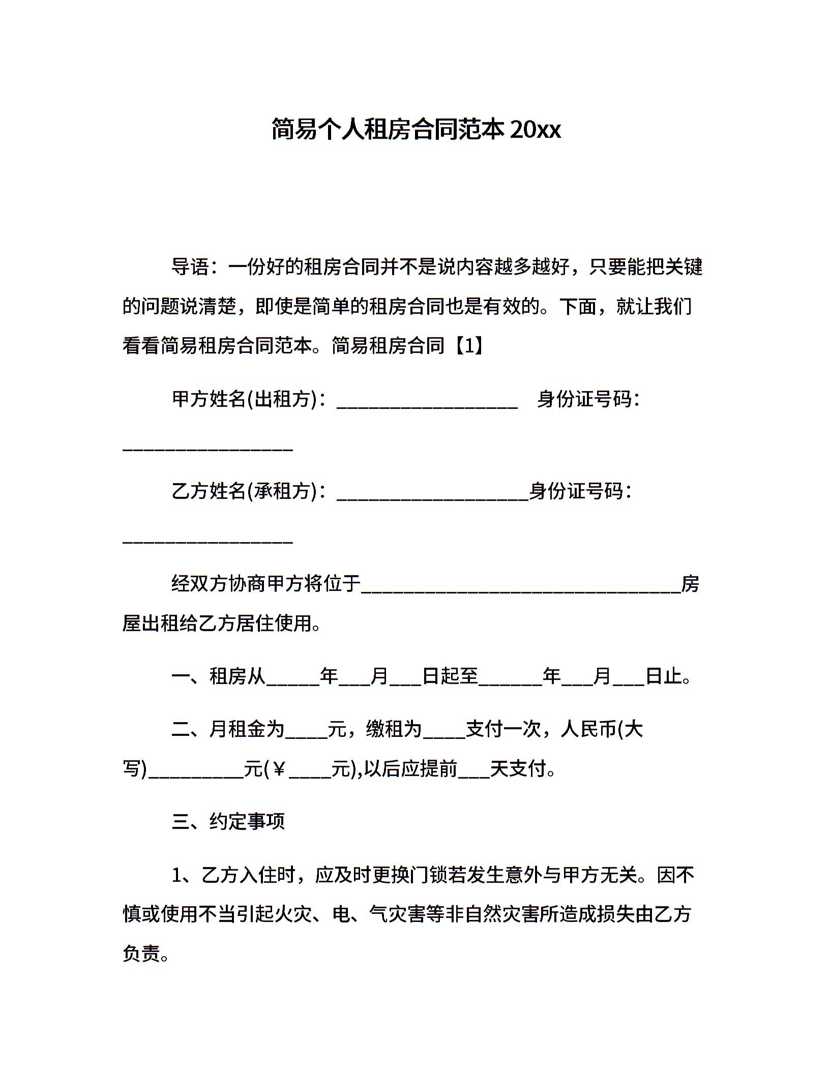 简易个人租房合同范本20xx
