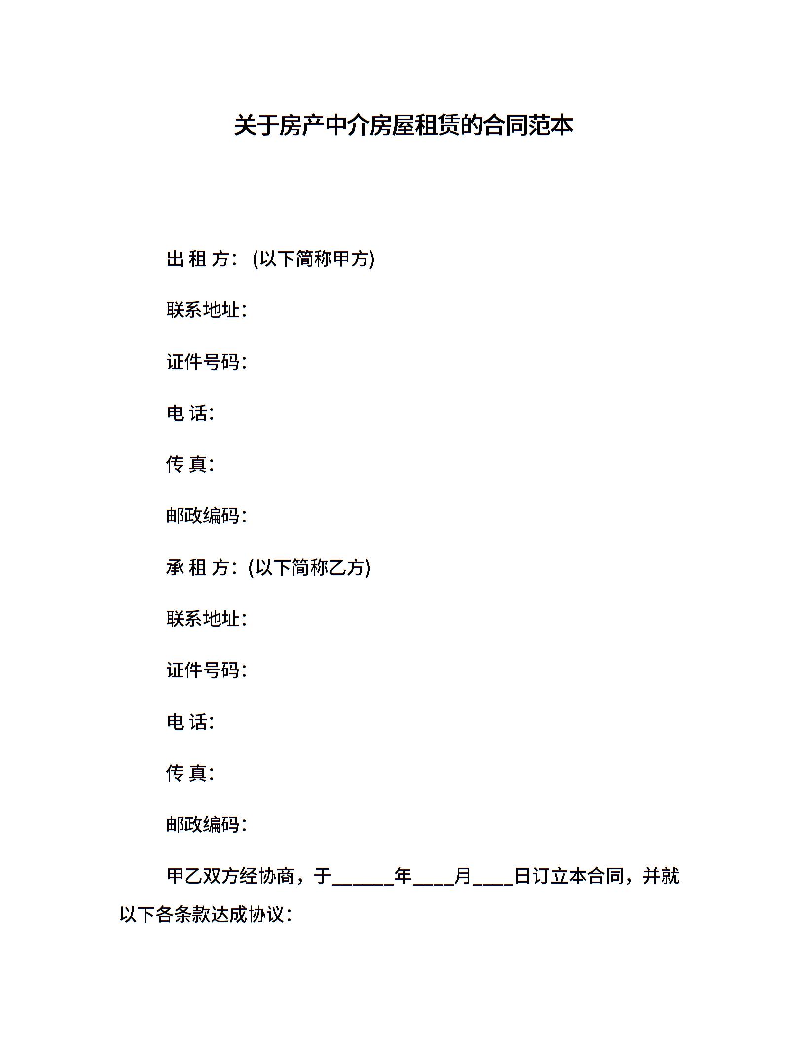 关于房产中介房屋租赁的合同范本