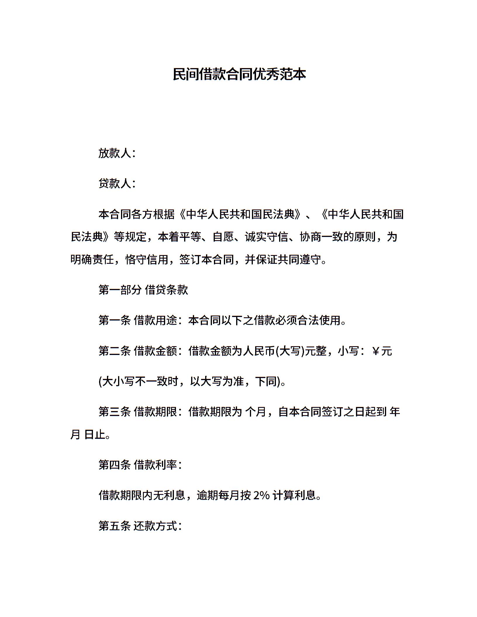 民间借款合同优秀范本