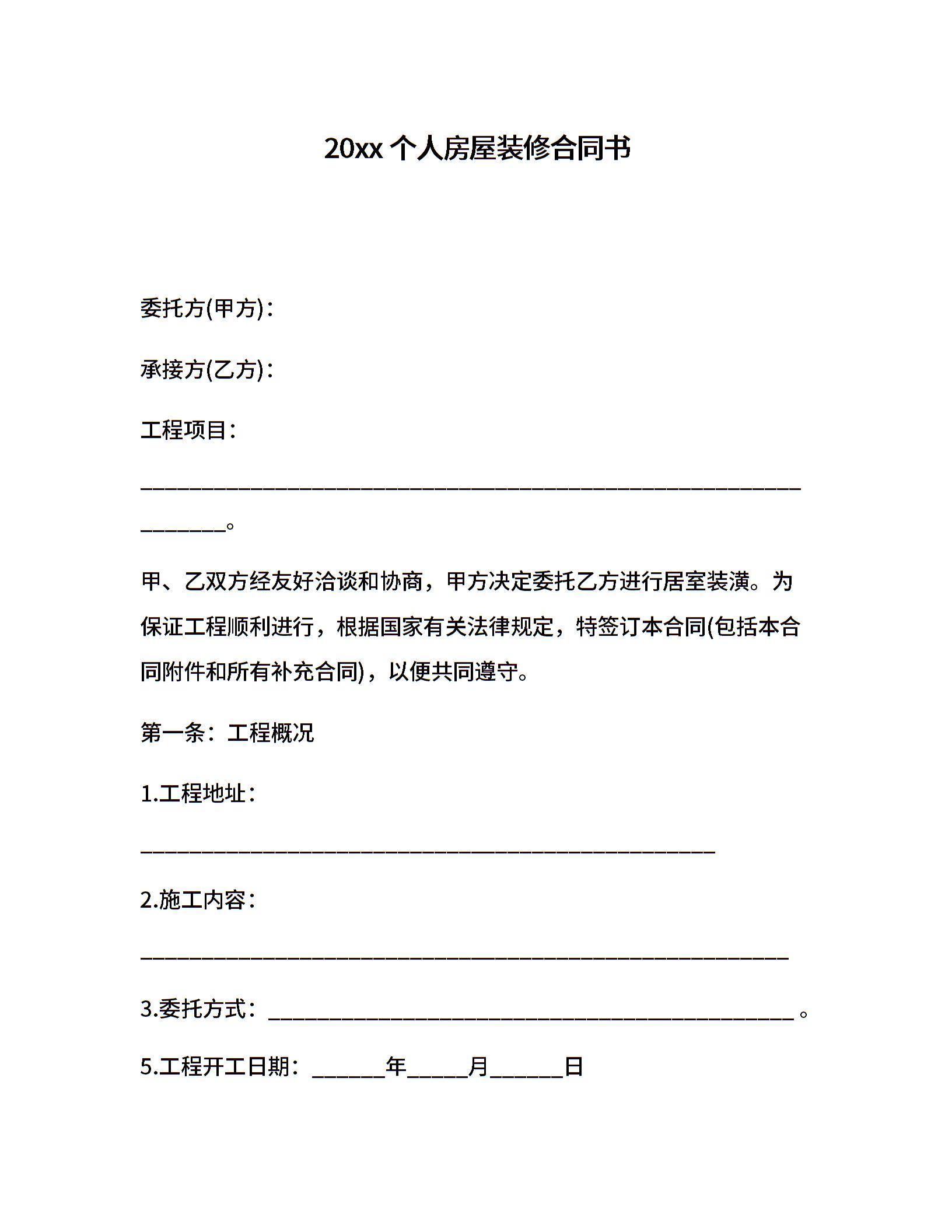 20xx个人房屋装修合同书