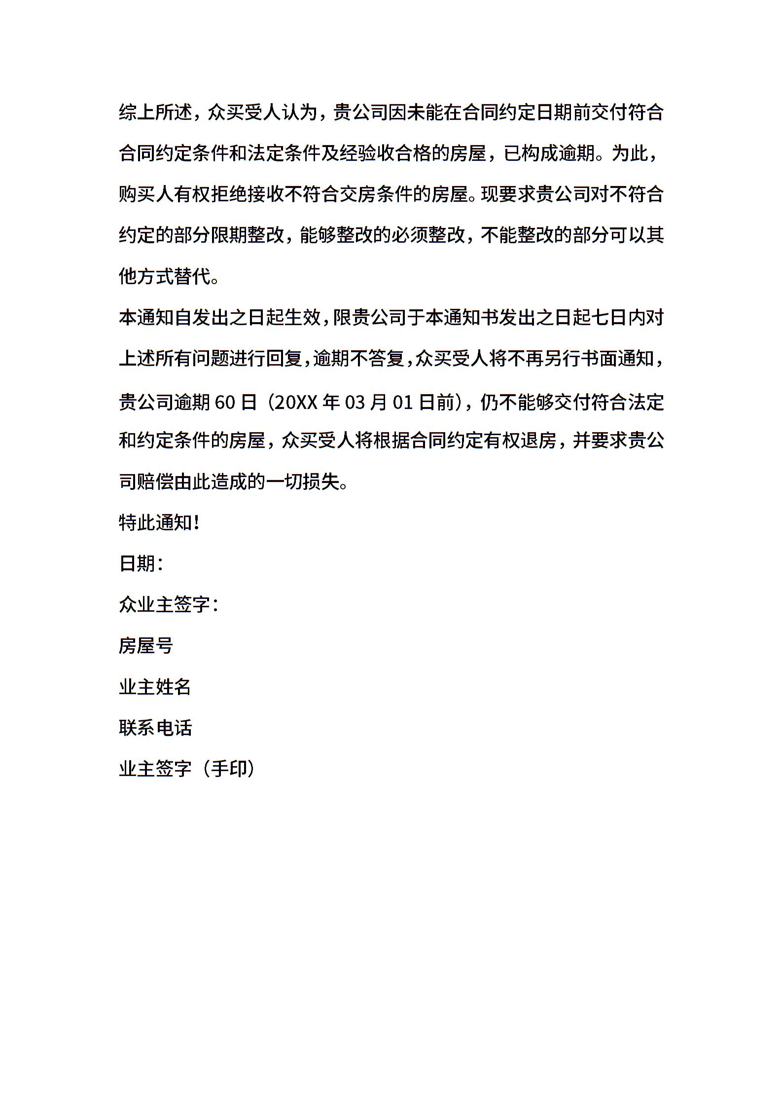 拒绝收房通知书