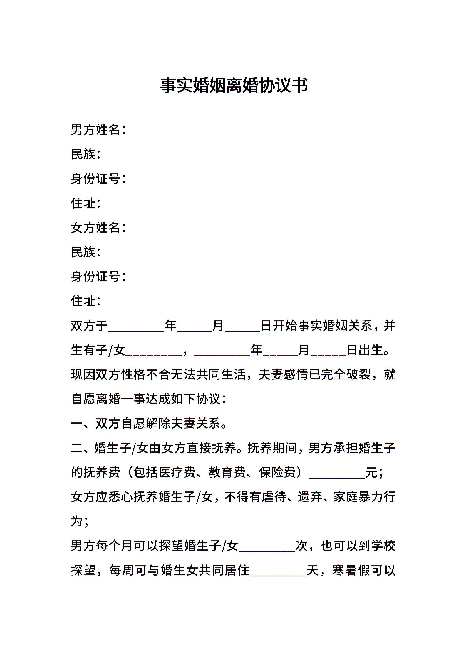 事实婚姻离婚协议书