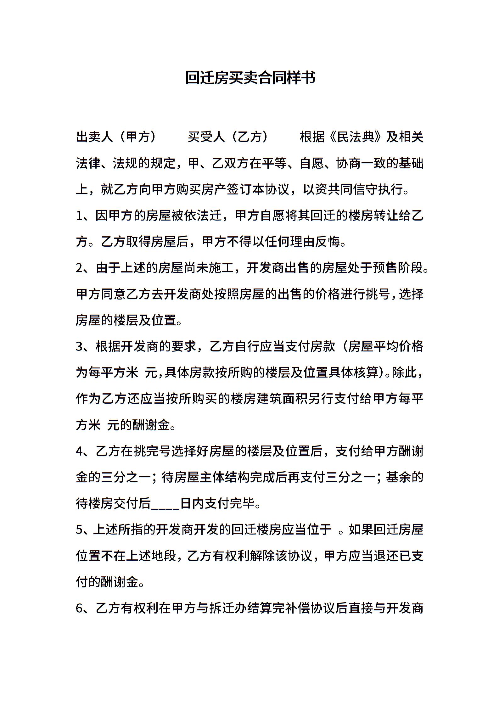 回迁房买卖合同样书