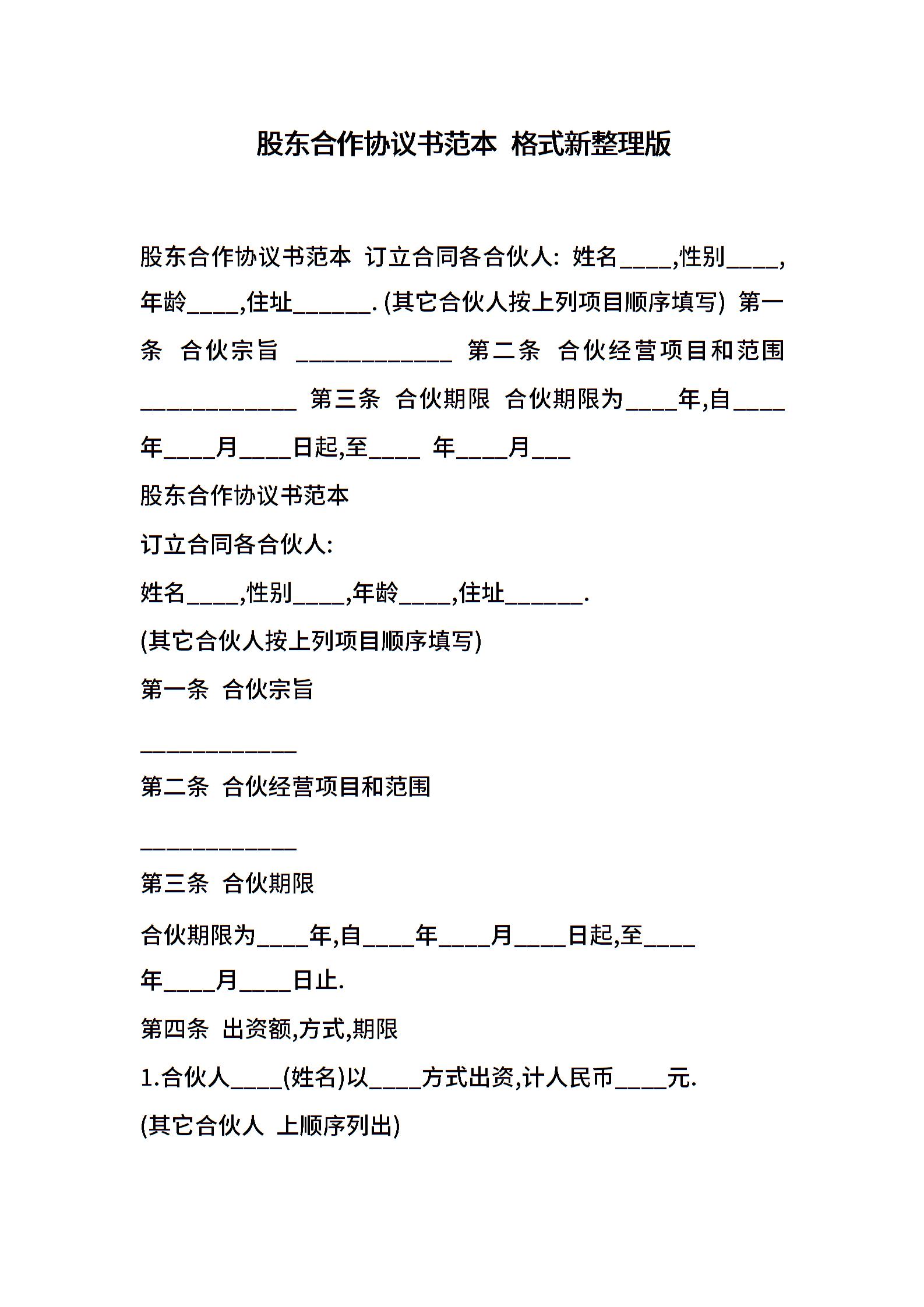 股东合作协议书范本 格式新整理版