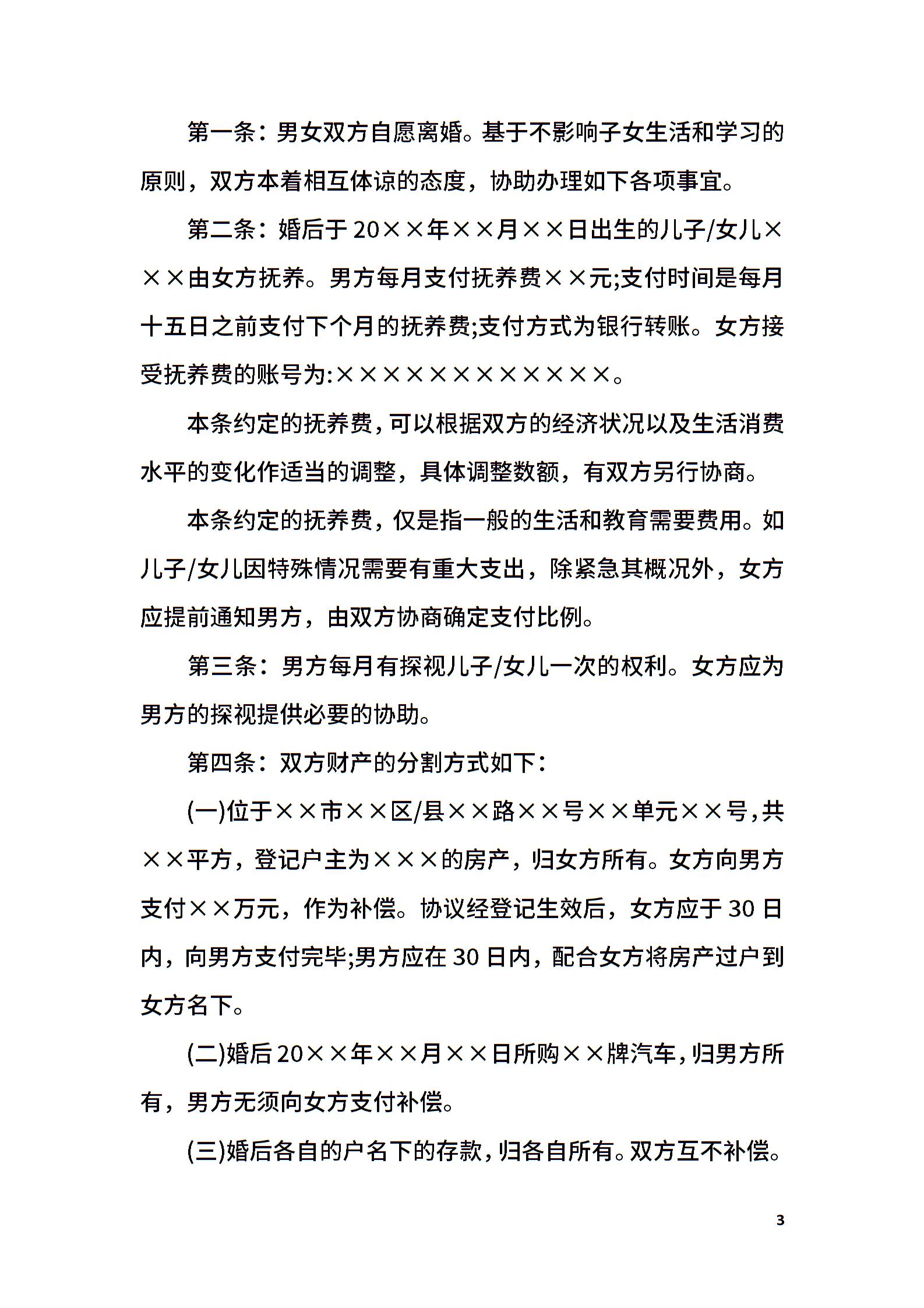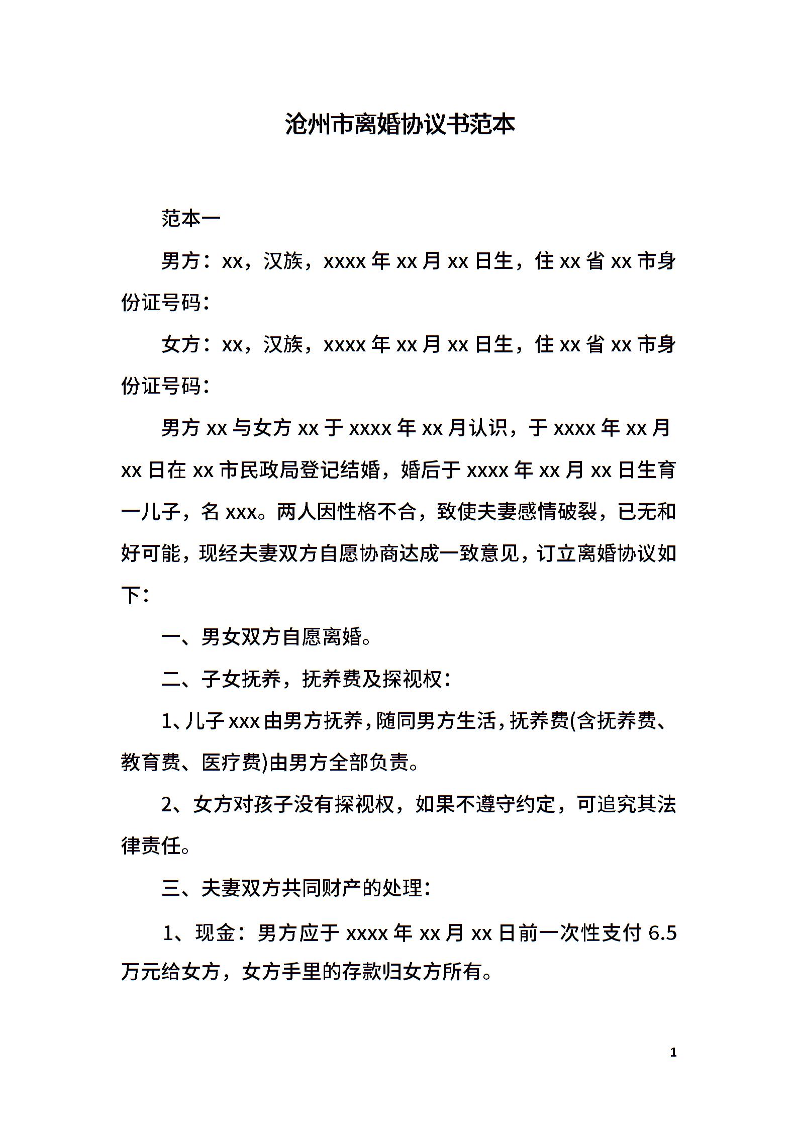沧州市离婚协议书范本