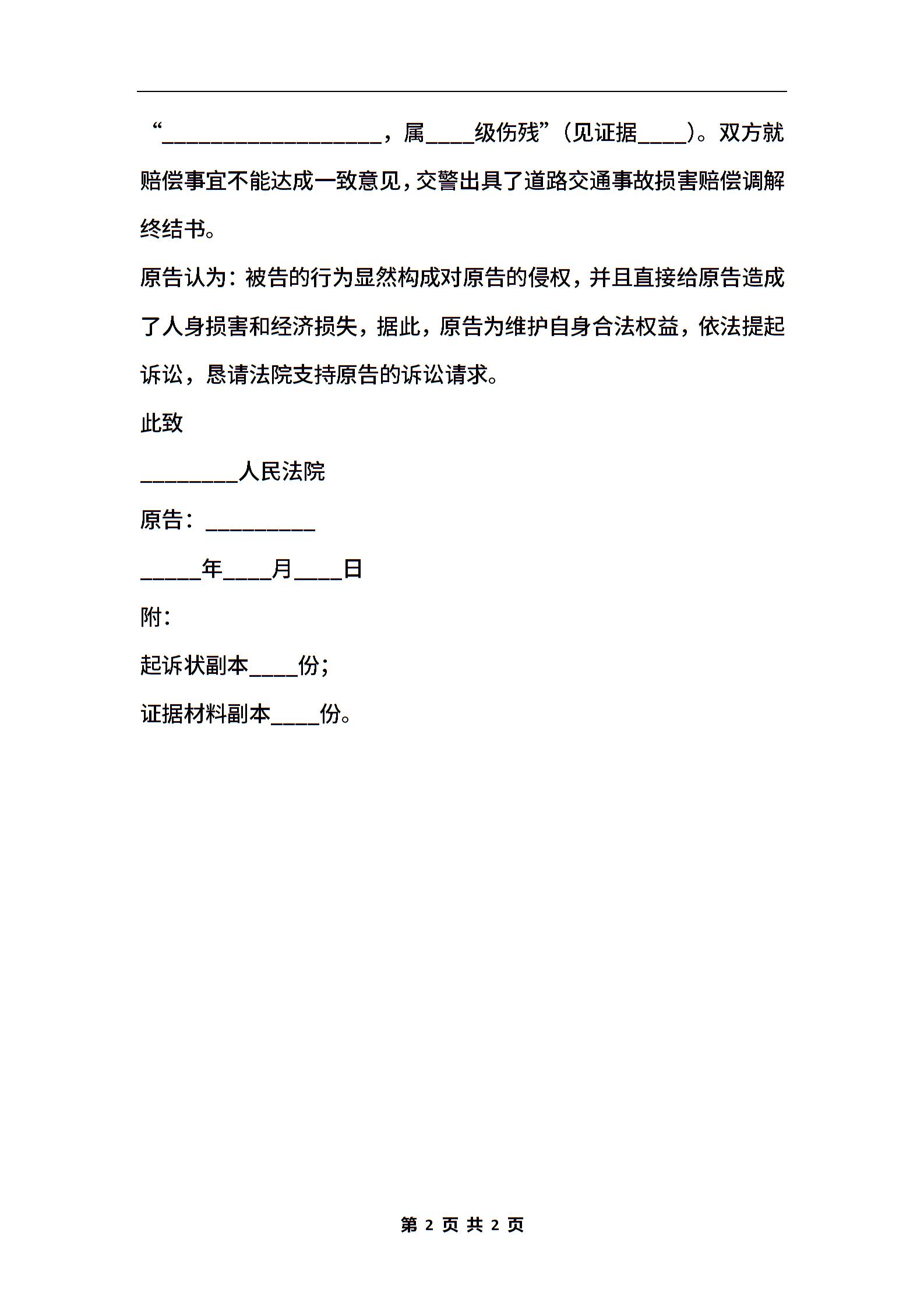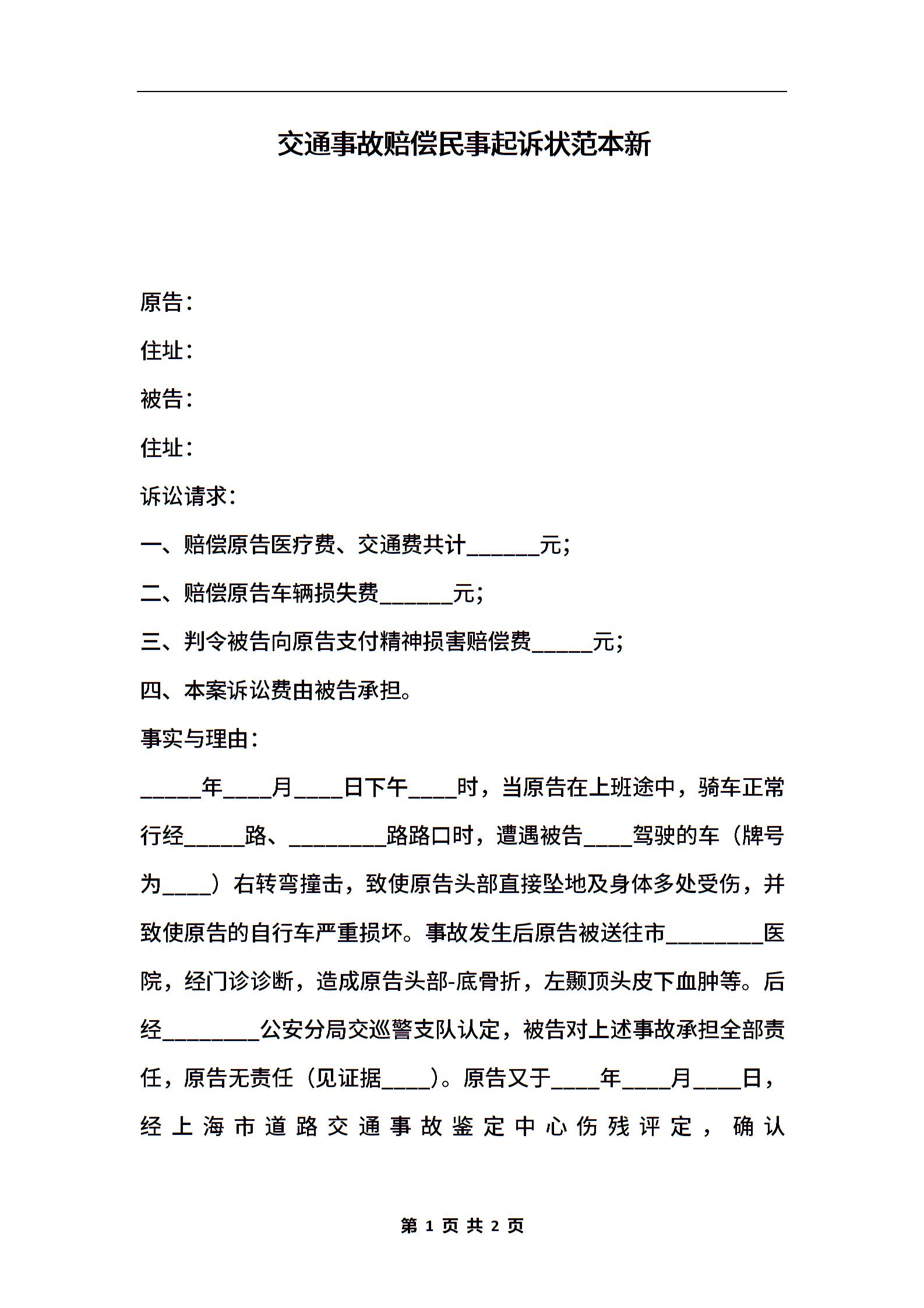 交通事故赔偿民事起诉状范本新