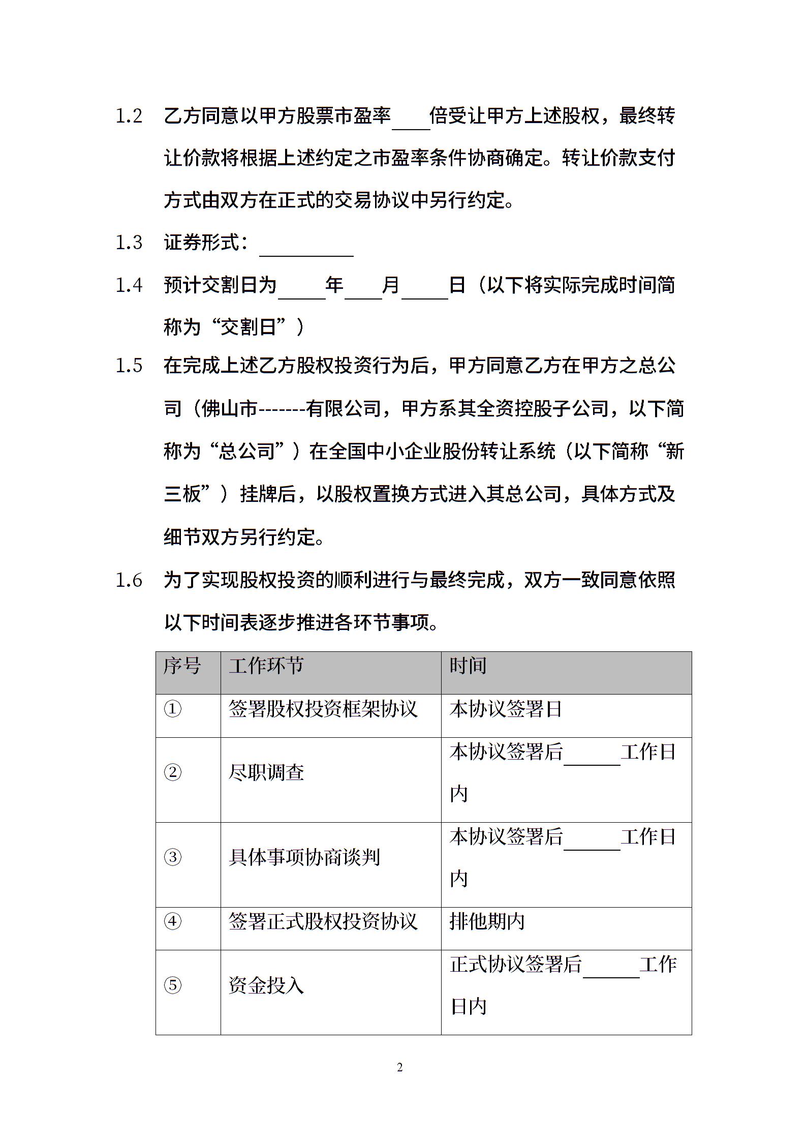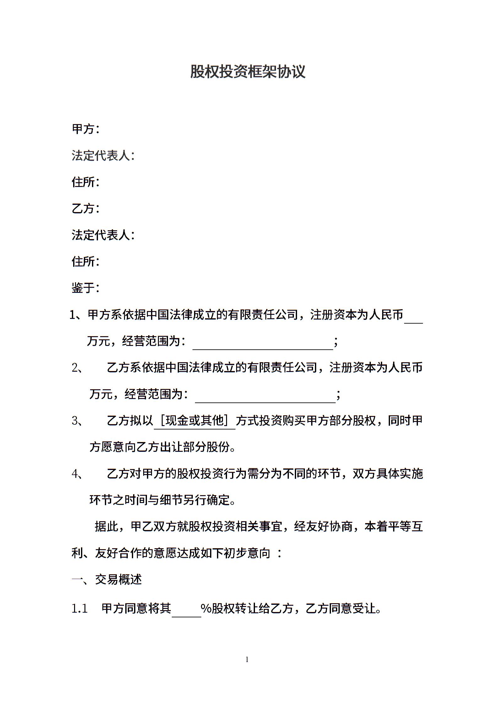 股权投资框架协议(最新版)