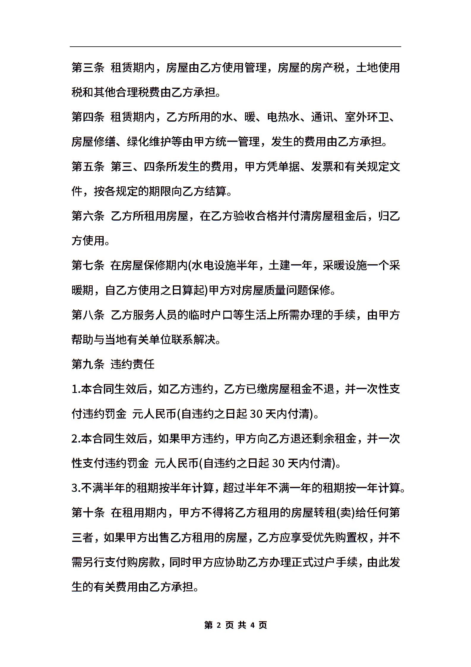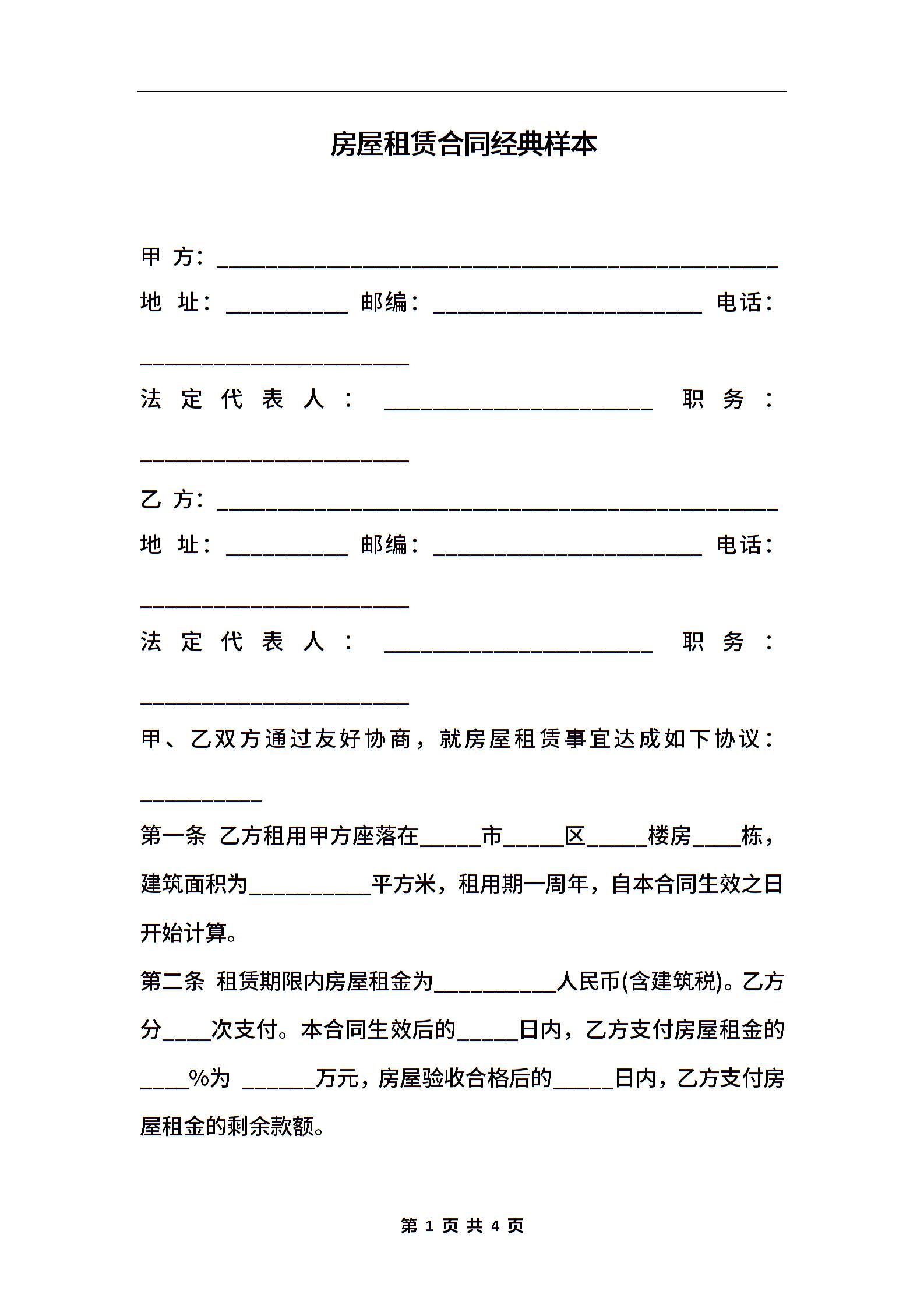房屋租赁合同经典样本