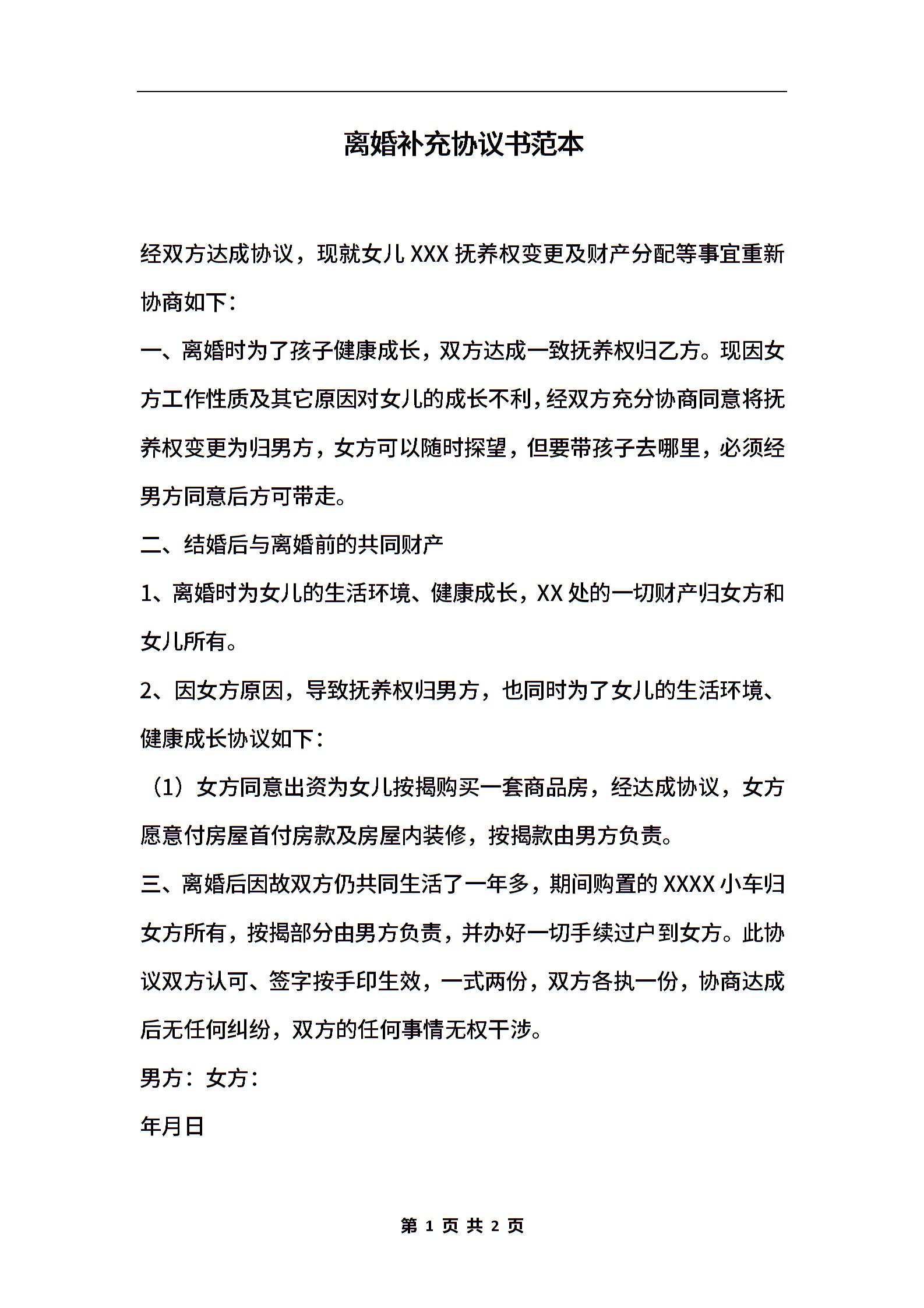离婚补充协议书范本