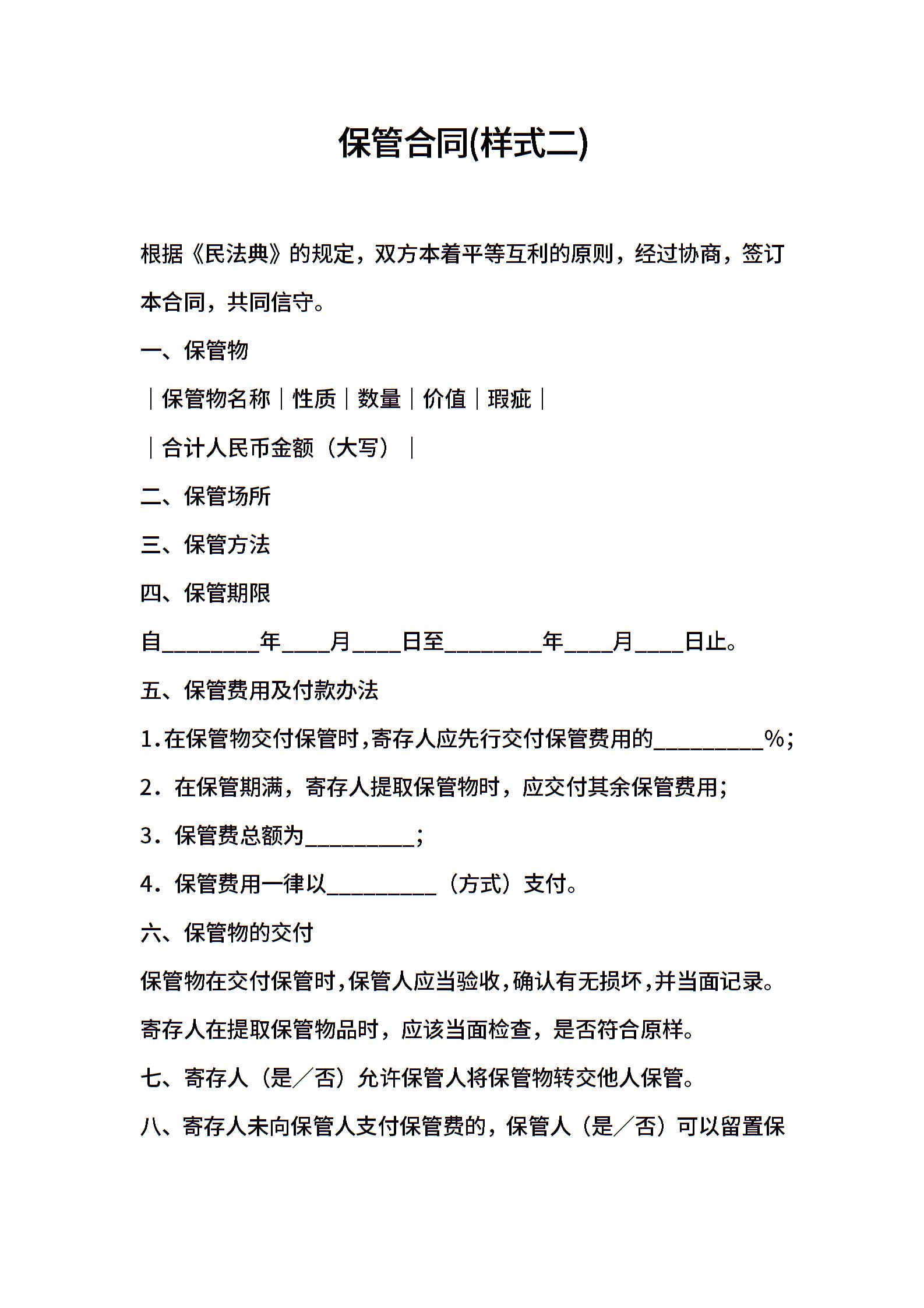 保管合同(样式二)