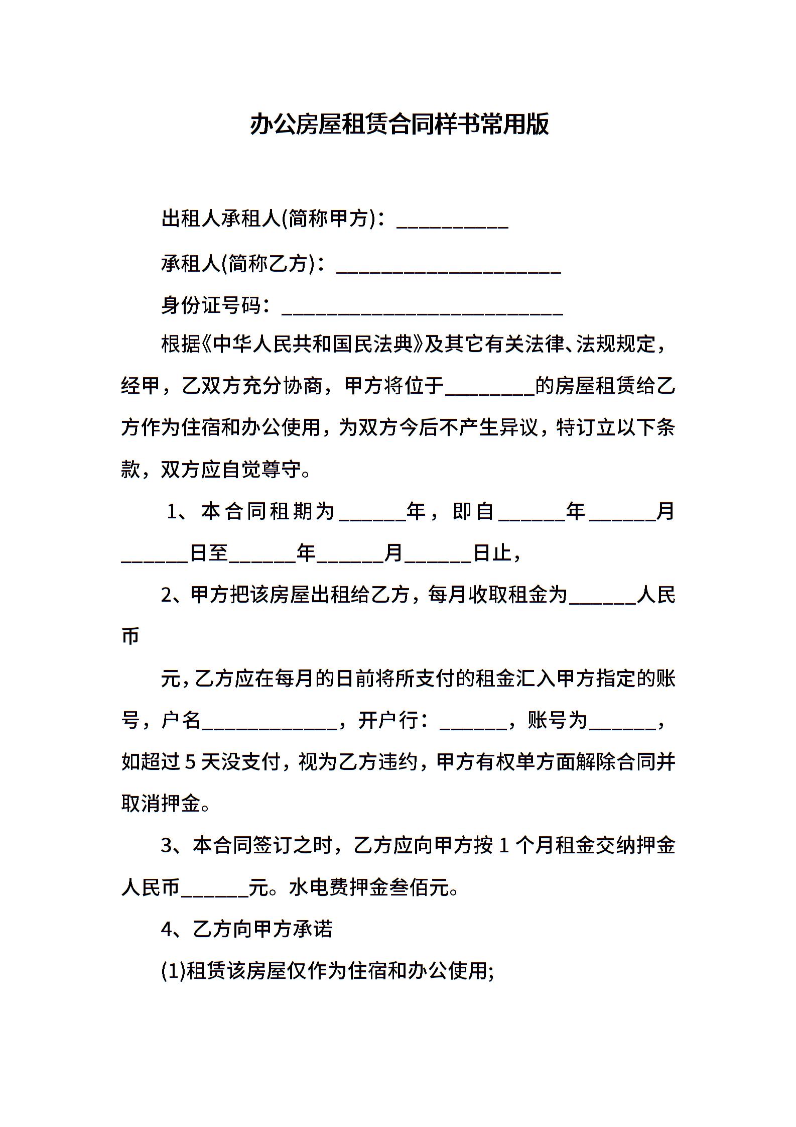 办公房屋租赁合同样书常用版