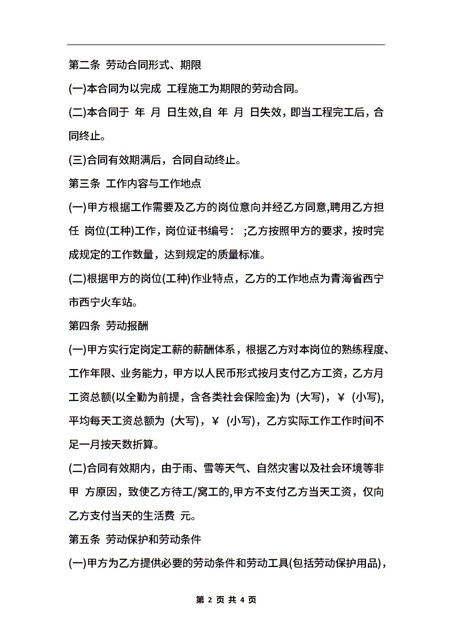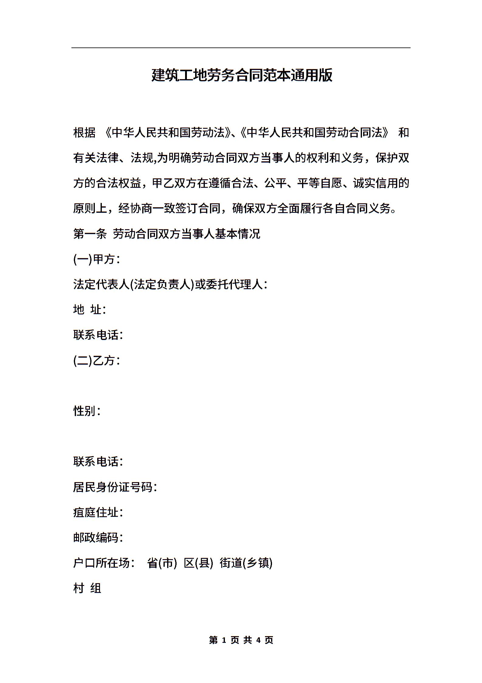 建筑工地劳务合同范本通用版