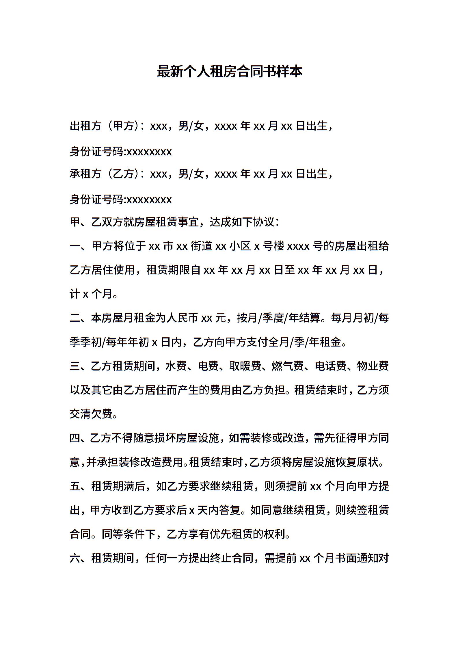 最新个人租房合同书样本