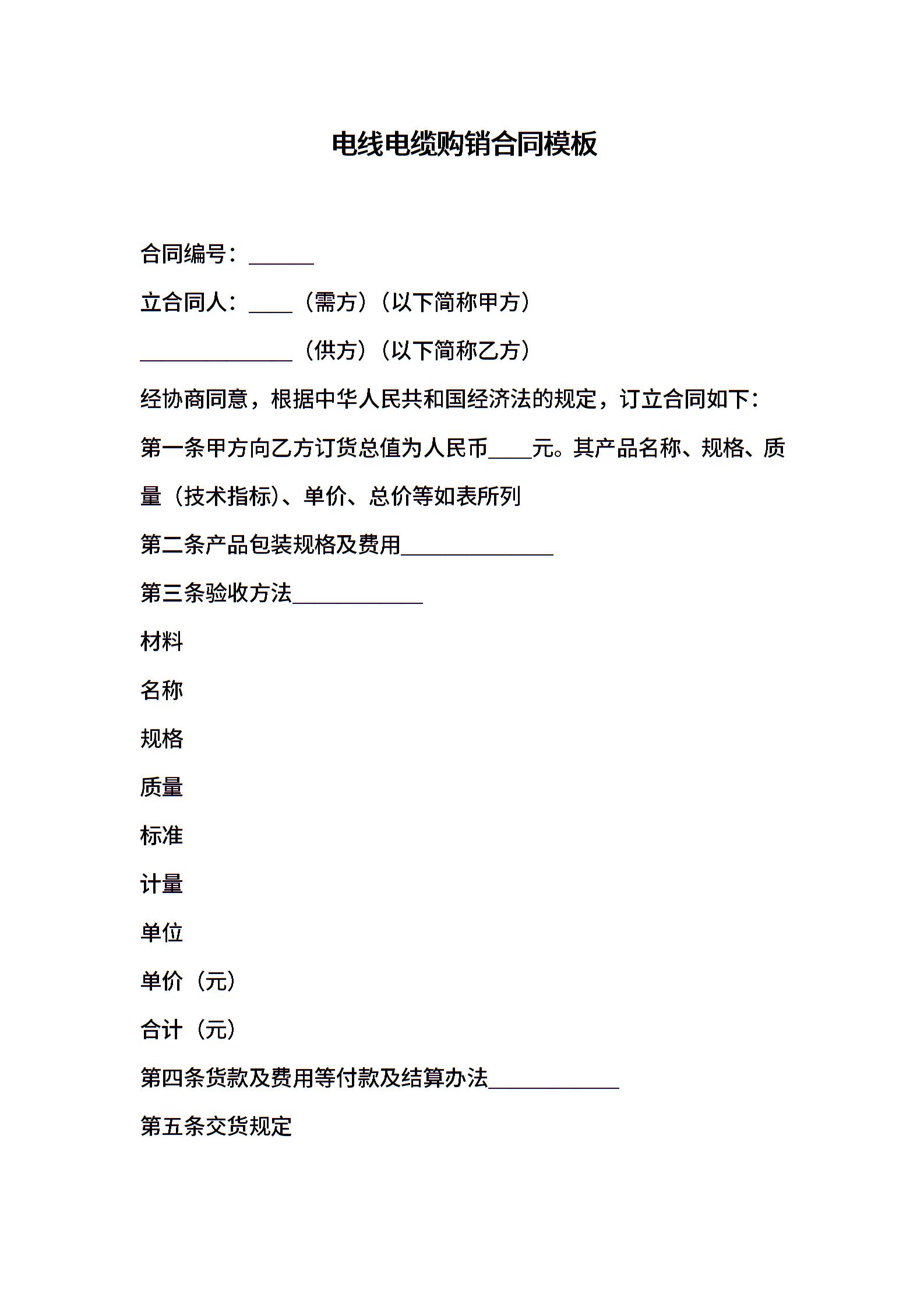 电线电缆购销合同模板
