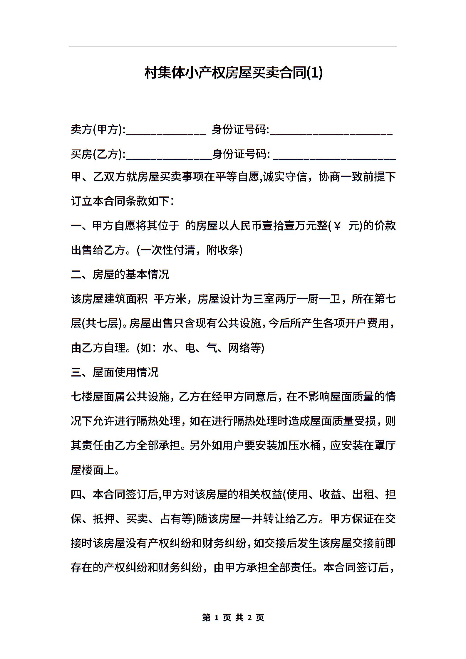 村集体小产权房屋买卖合同(1)