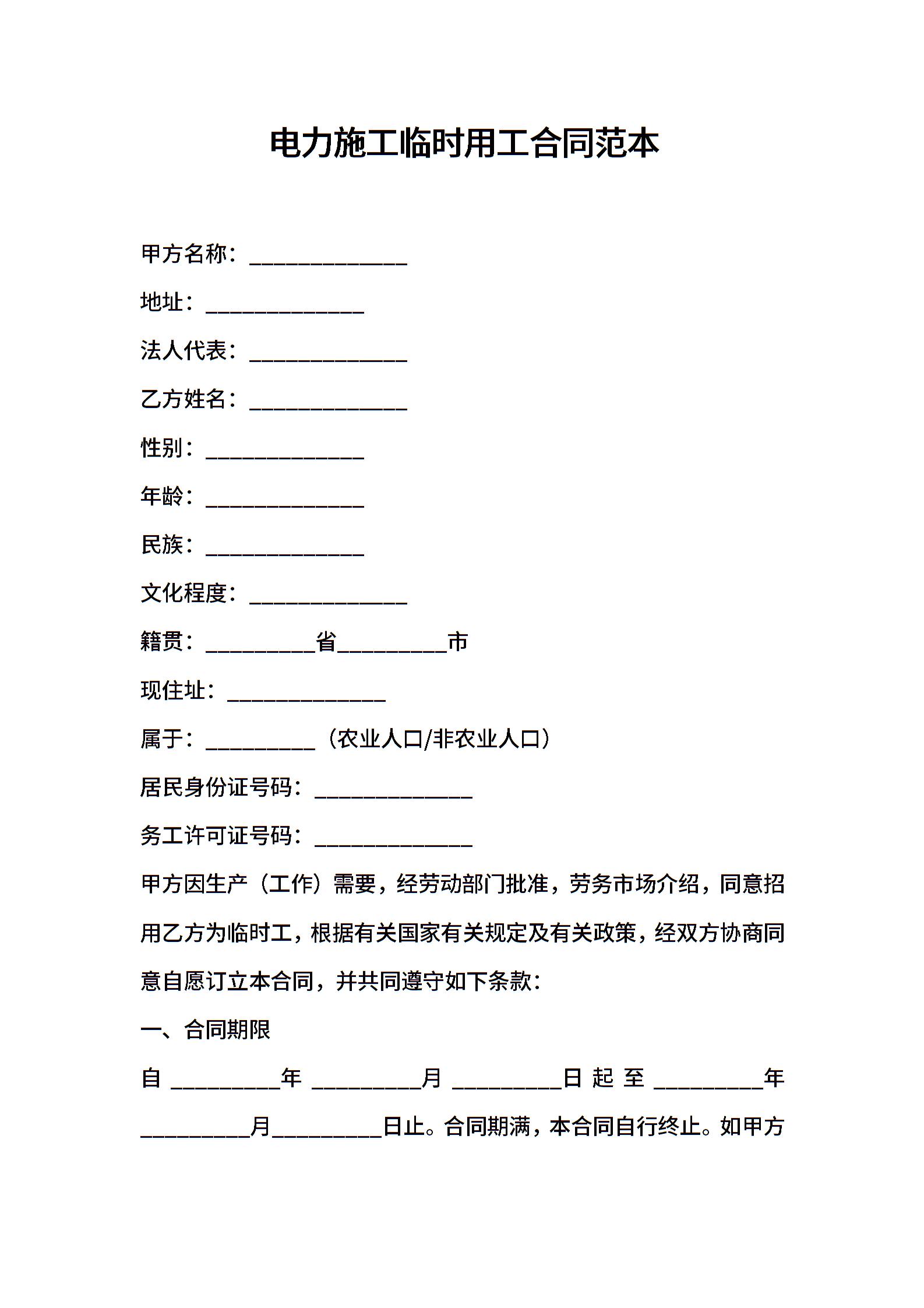 电力施工临时用工合同范本