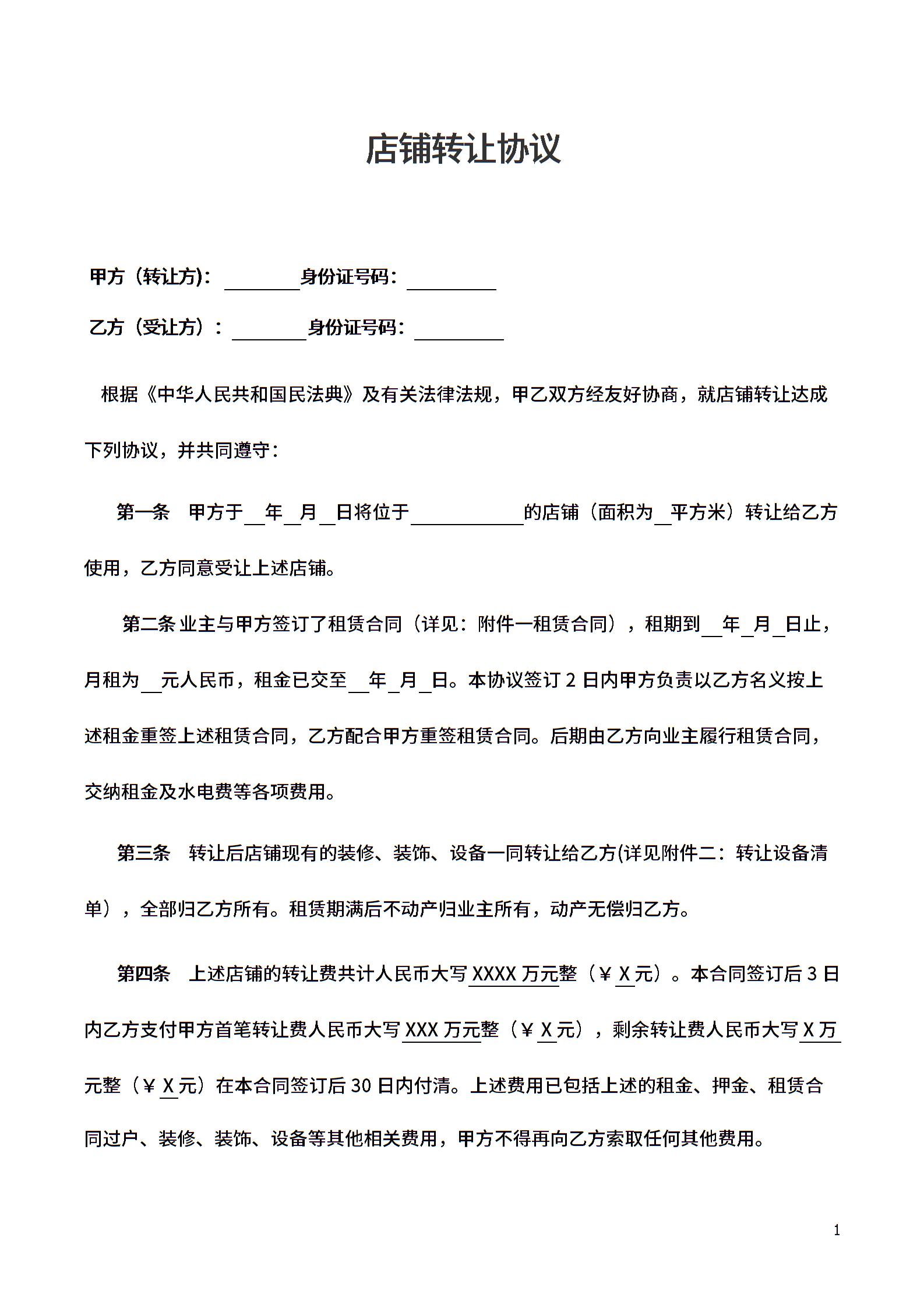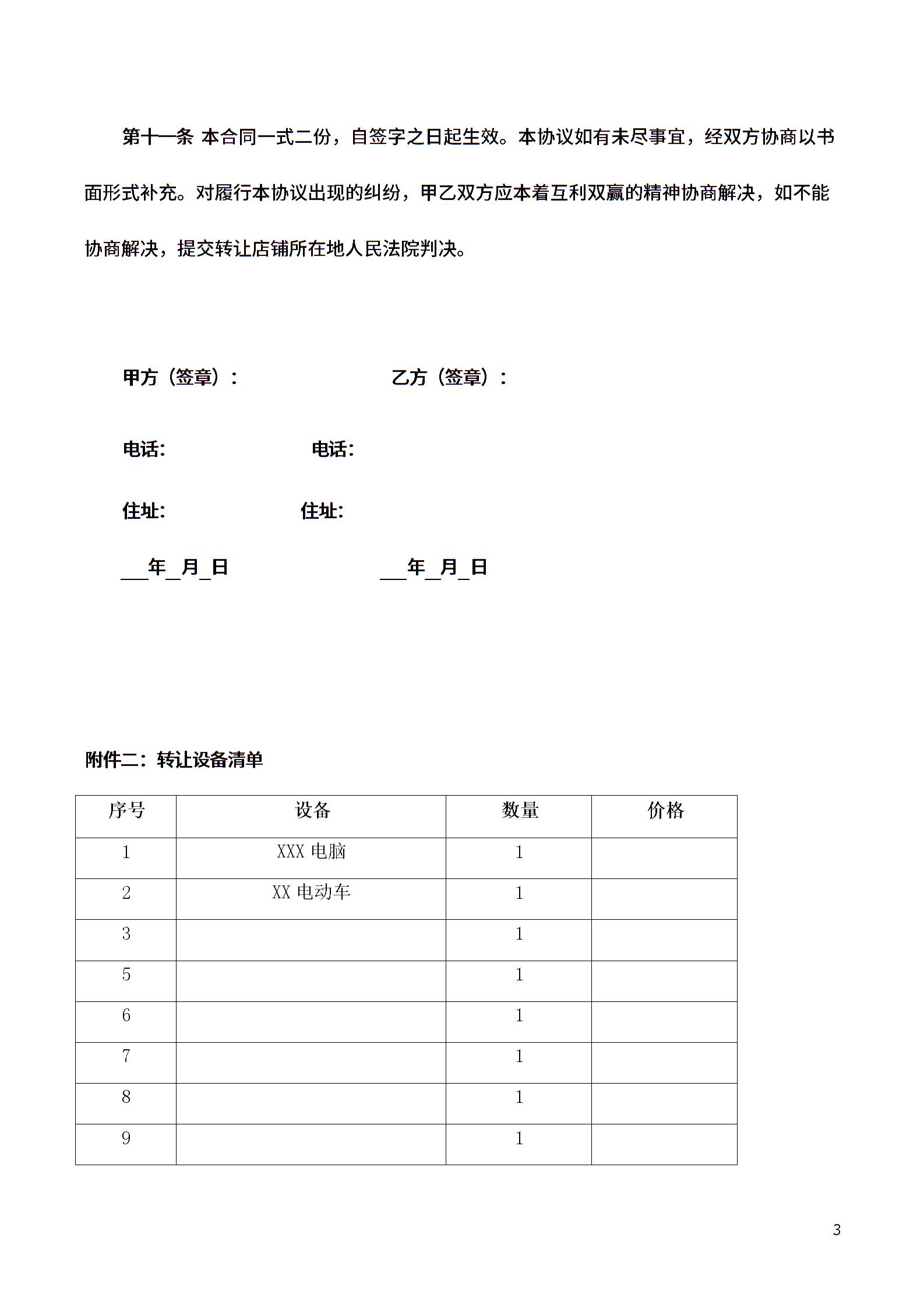 店铺转让协议(附带转让设备清单)律师拟定版本