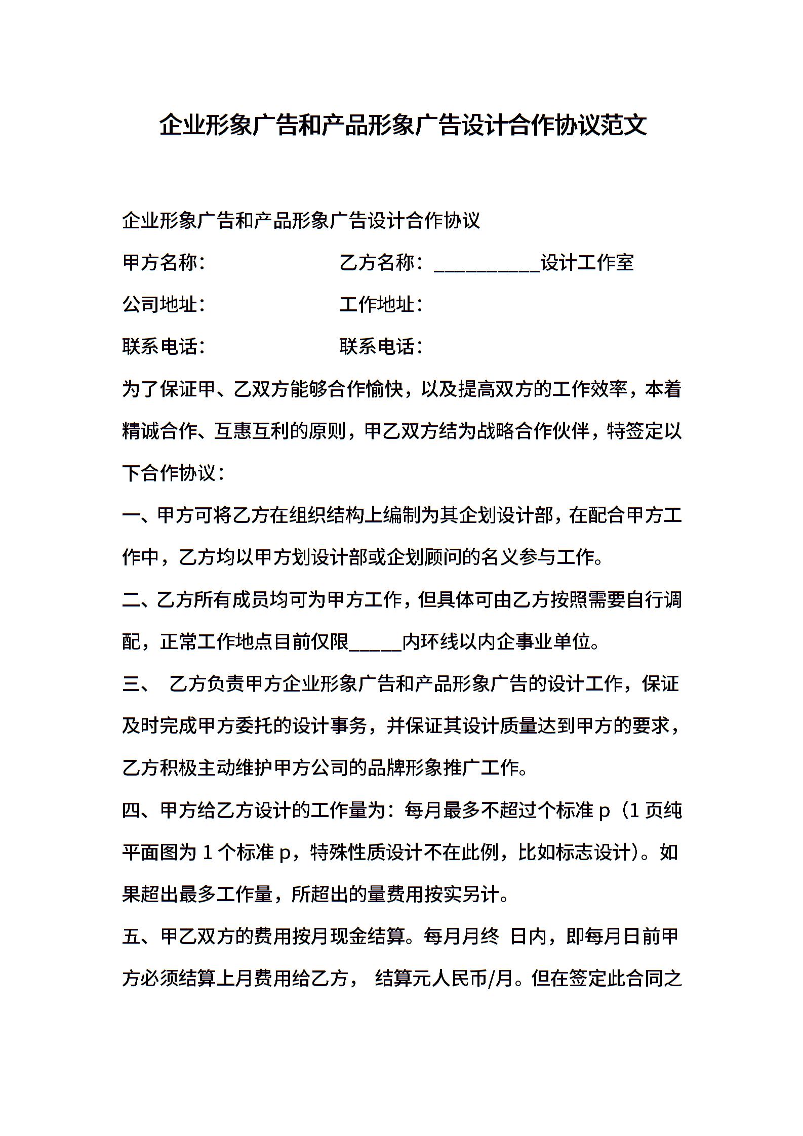企业形象广告和产品形象广告设计合作协议范文