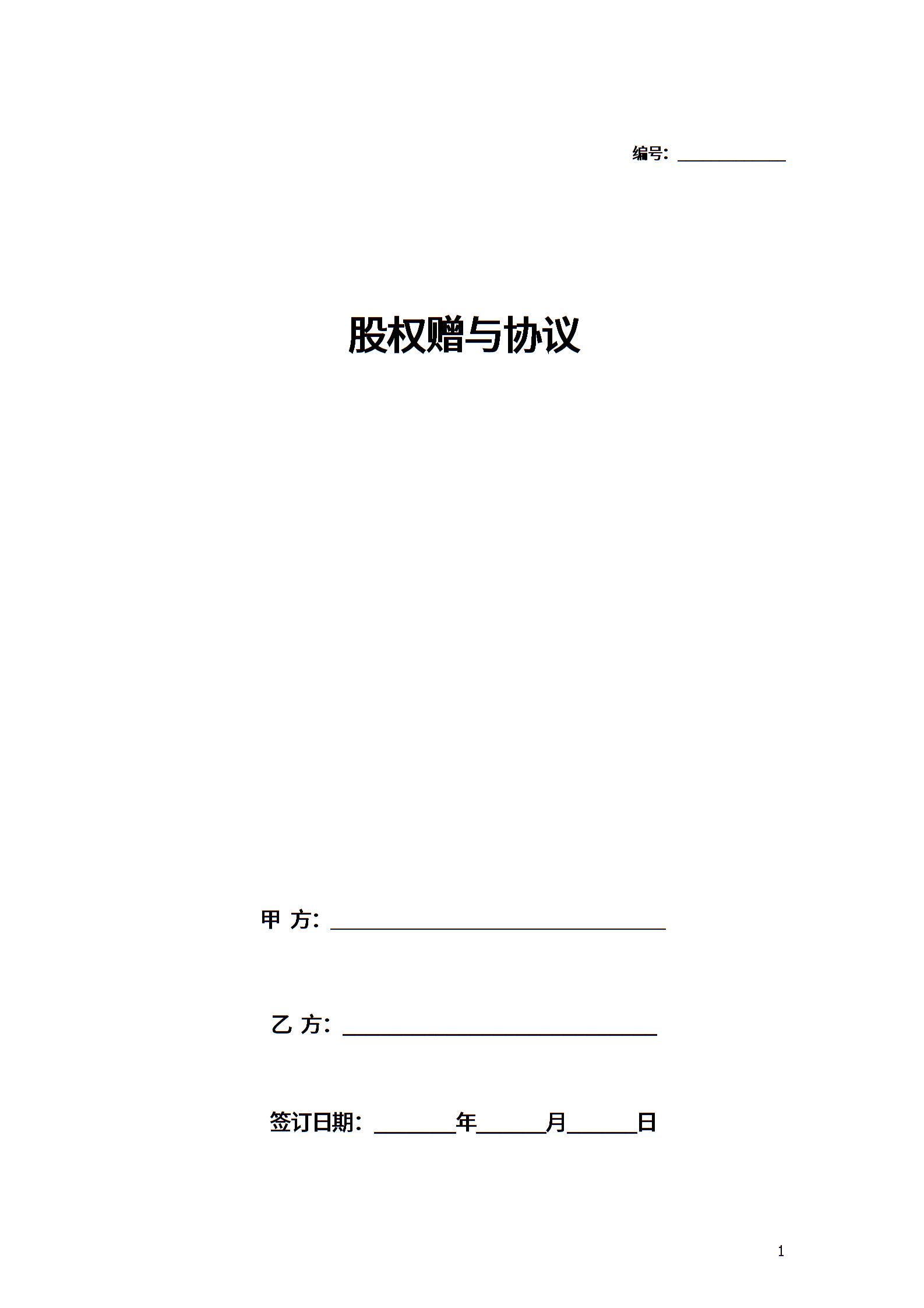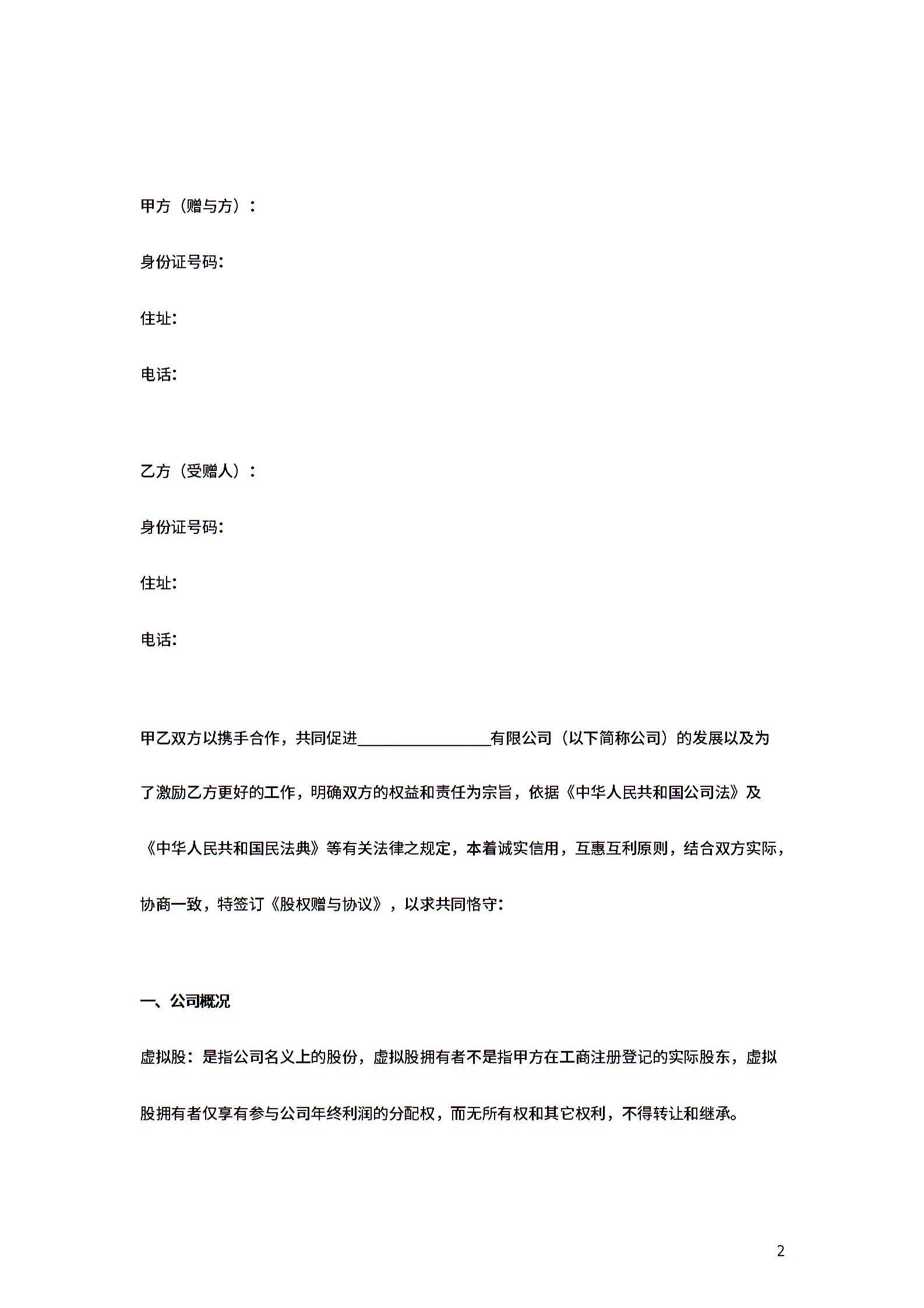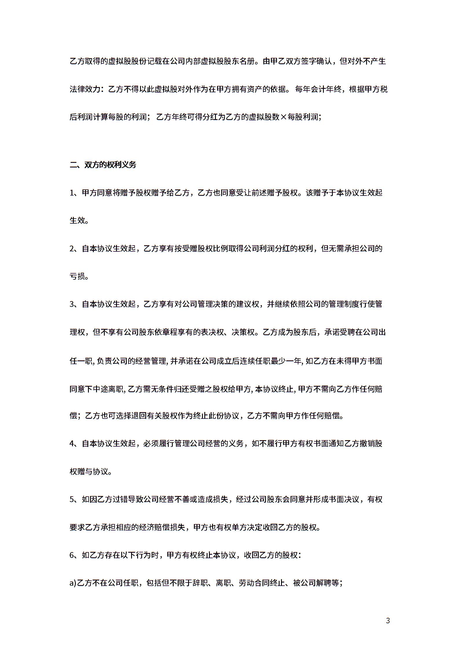 股权赠与合同协议范本模板 (员工虚拟股)