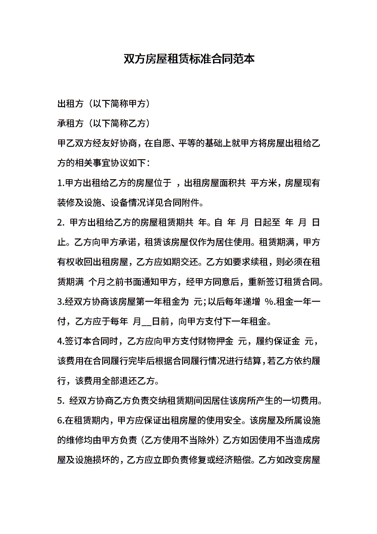 双方房屋租赁标准合同范本
