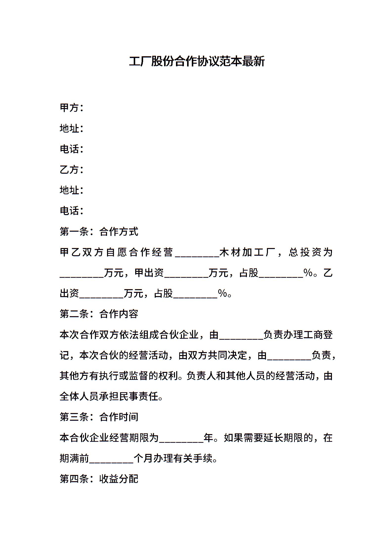 工厂股份合作协议范本最新